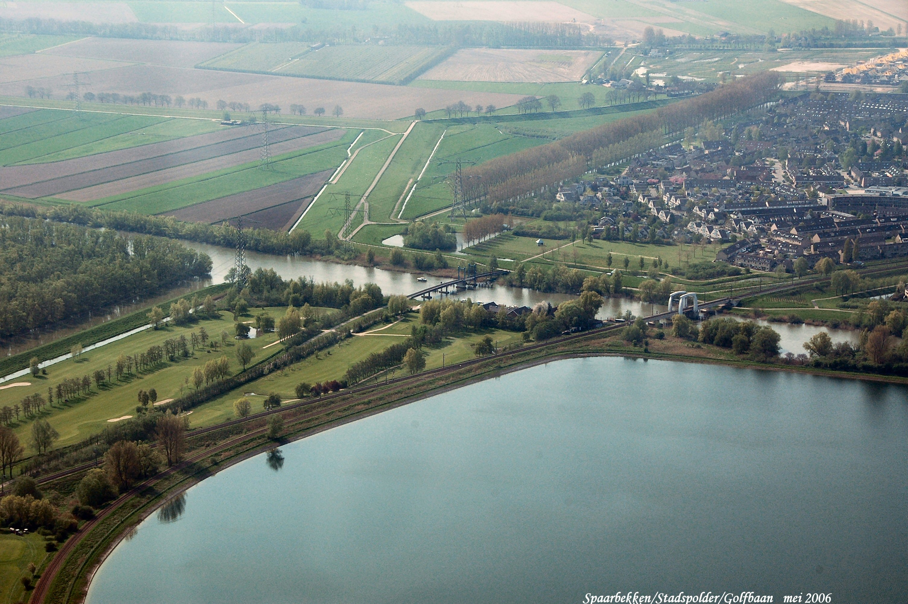 Spaarbekken "De Grote Rug" met de spoorlijn Dordrecht-Sliedrecht.Rechts boven is de Stadspolder met het Wantij in het midden, geheel boven van links naar rechts is de Provincialeweg. gezien in Zuid/Oostelijke richting.