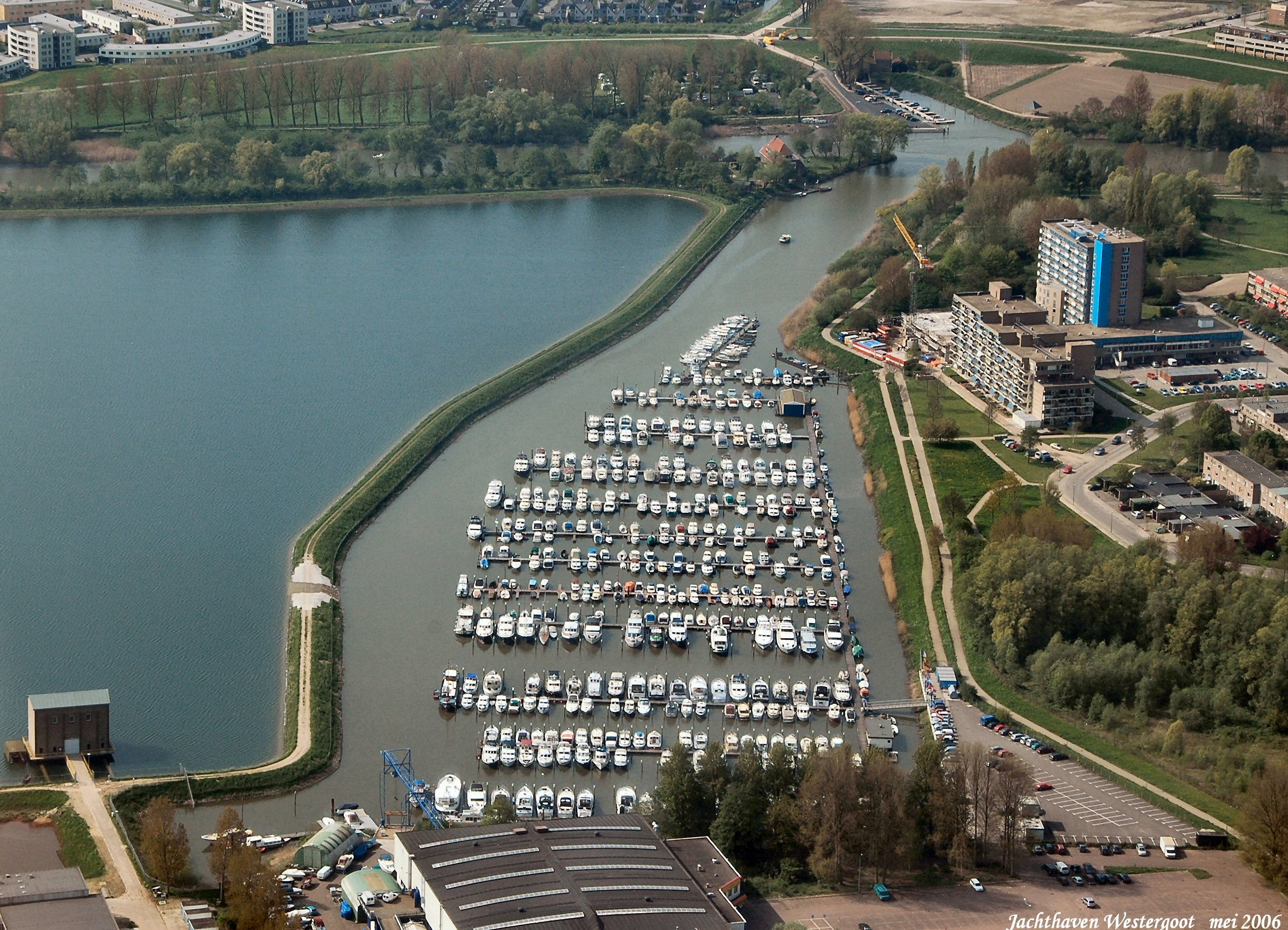 Links het waterbekken "De Grote Rug" met rechts er van jachthaven Westergoot, boven is de Wantijdijk met Stadspolder gezien in Zuidelijke richting.