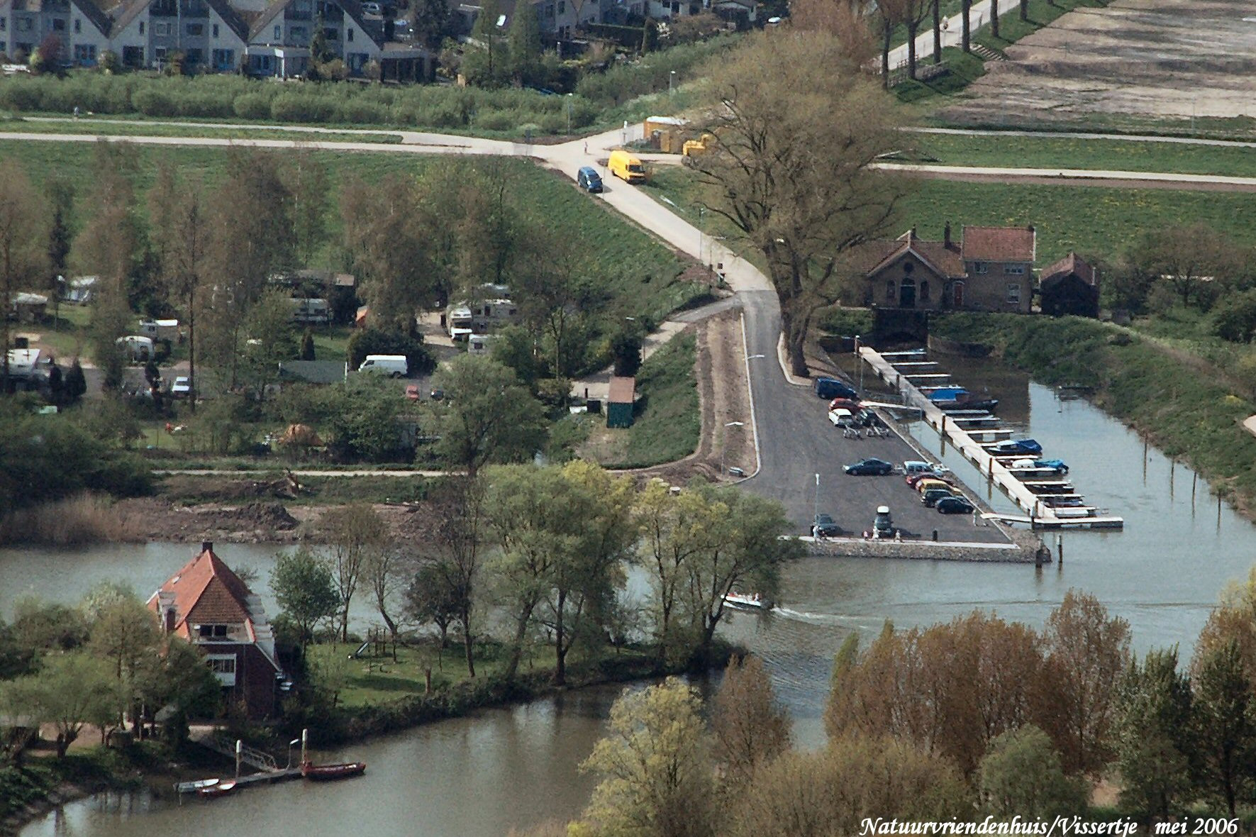 Links onder het Natuurvriendenhuis met het Wantij er boven. Mid.rechts het gemaal met de Loswal. Mid.links Camping het Vissertje. Boven van links naar rechts is de Wantijdijk gezien in Zuidelijke richting.