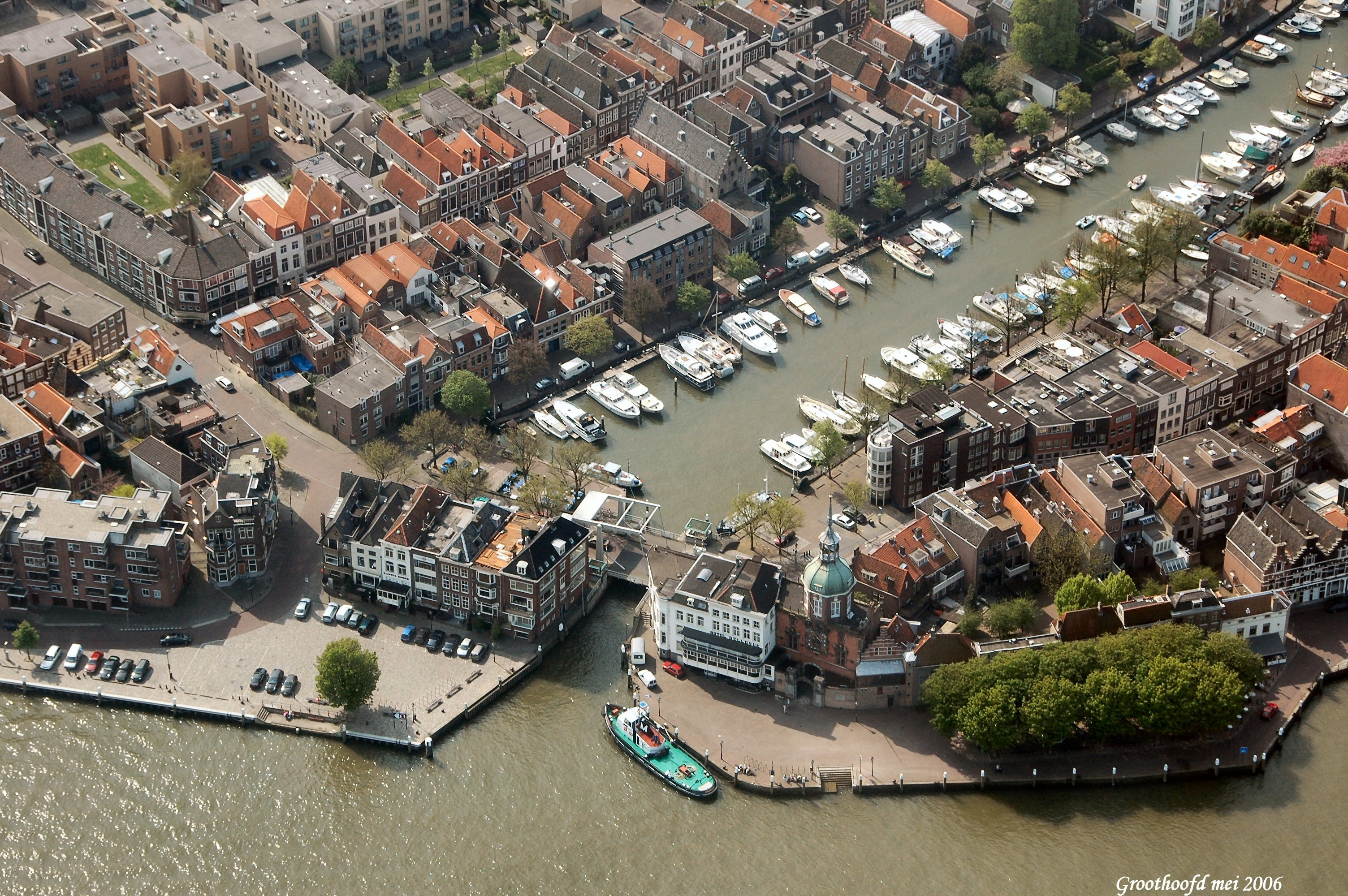 Links de Beneden Merwede en rechts de Oude Maas. met er achter links de Merwekade en het Groothoofd rechts, wijnhaven op de achtergrond.
