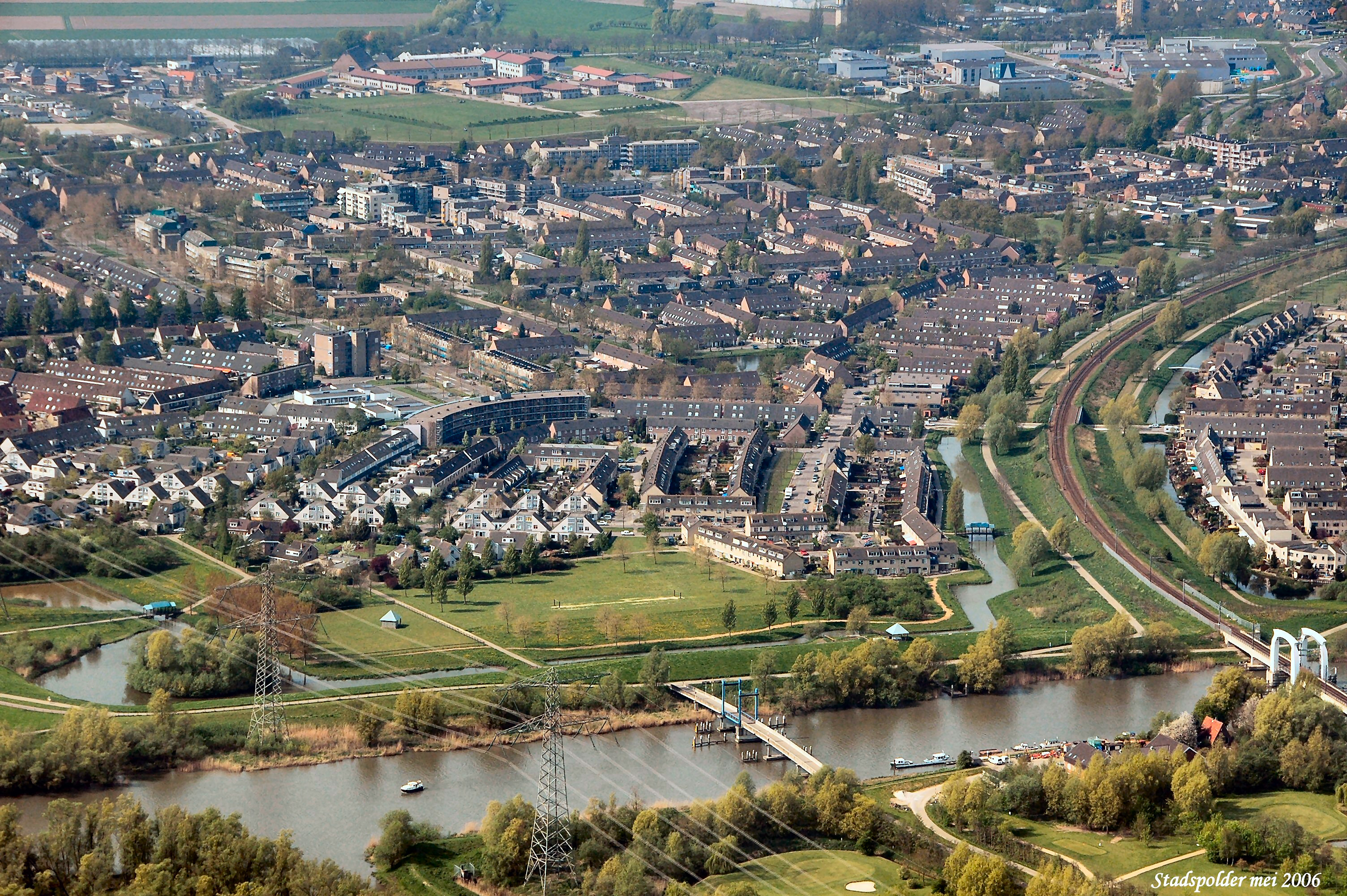 Onder is het Wantij met de spoorbrug en fietsbrug. geheel boven is Stichting De Hoop met de Stadspolder er onder gezien in Zuidelijke richting.