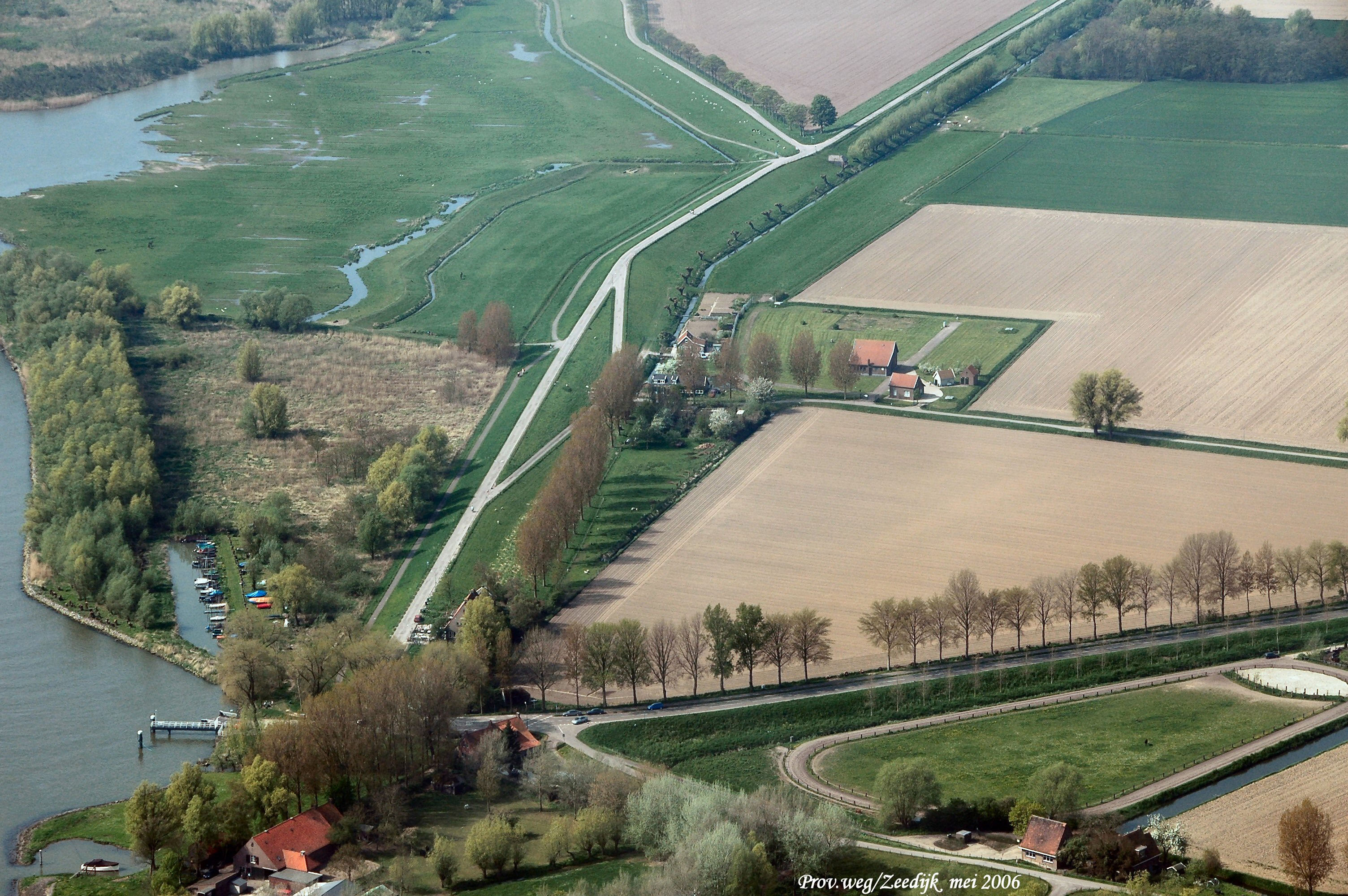 Kop van Land met links onder de Kopse Stee metb er boven de aanlegsteiger van het veer op Werkendam rechts onder is het gemaal Staring aan de Zeedijk. Van rechts naar links is de Provincialeweg. gezien in Oostelijke richting.