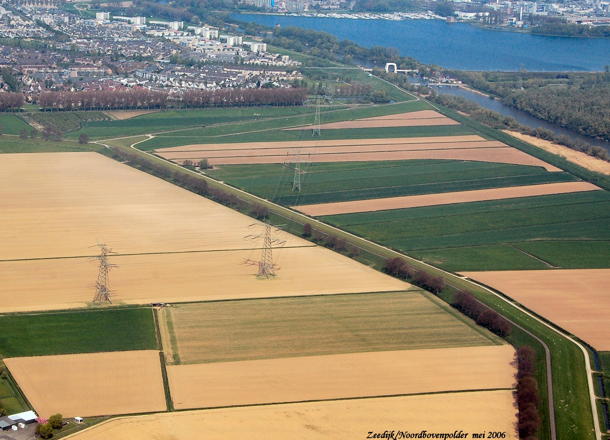 Links onder is de Noordpolder met rechts de Noordbovenpolder. links boven is Stadspolder en rechts boven het waterbekken De Grote Rug gezien in Westelijke richting.