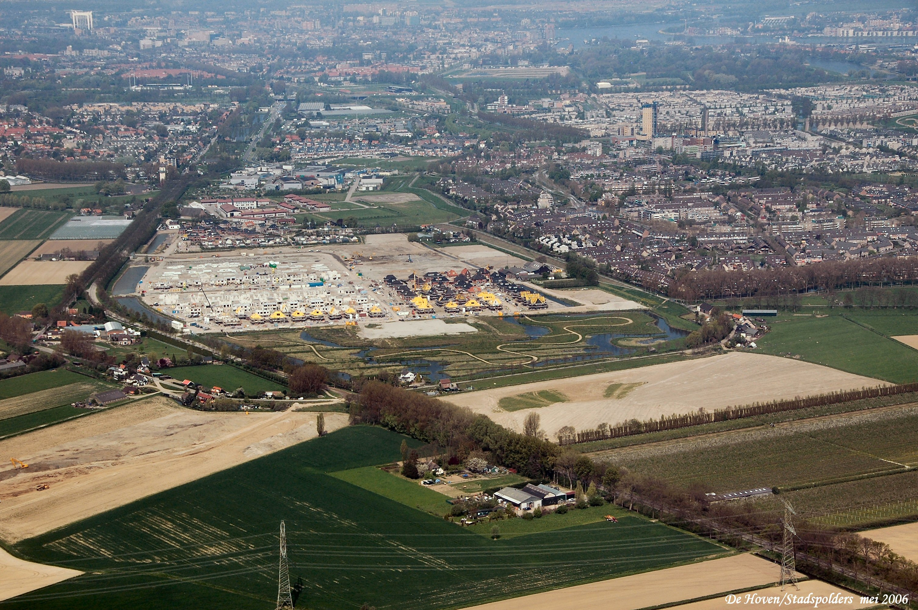 In het midden bouw van "De Hoven" met rechts er van de Stadspolder. Rechts onder naar links is de provincialeweg gezien in Noord/Westelijke richting.