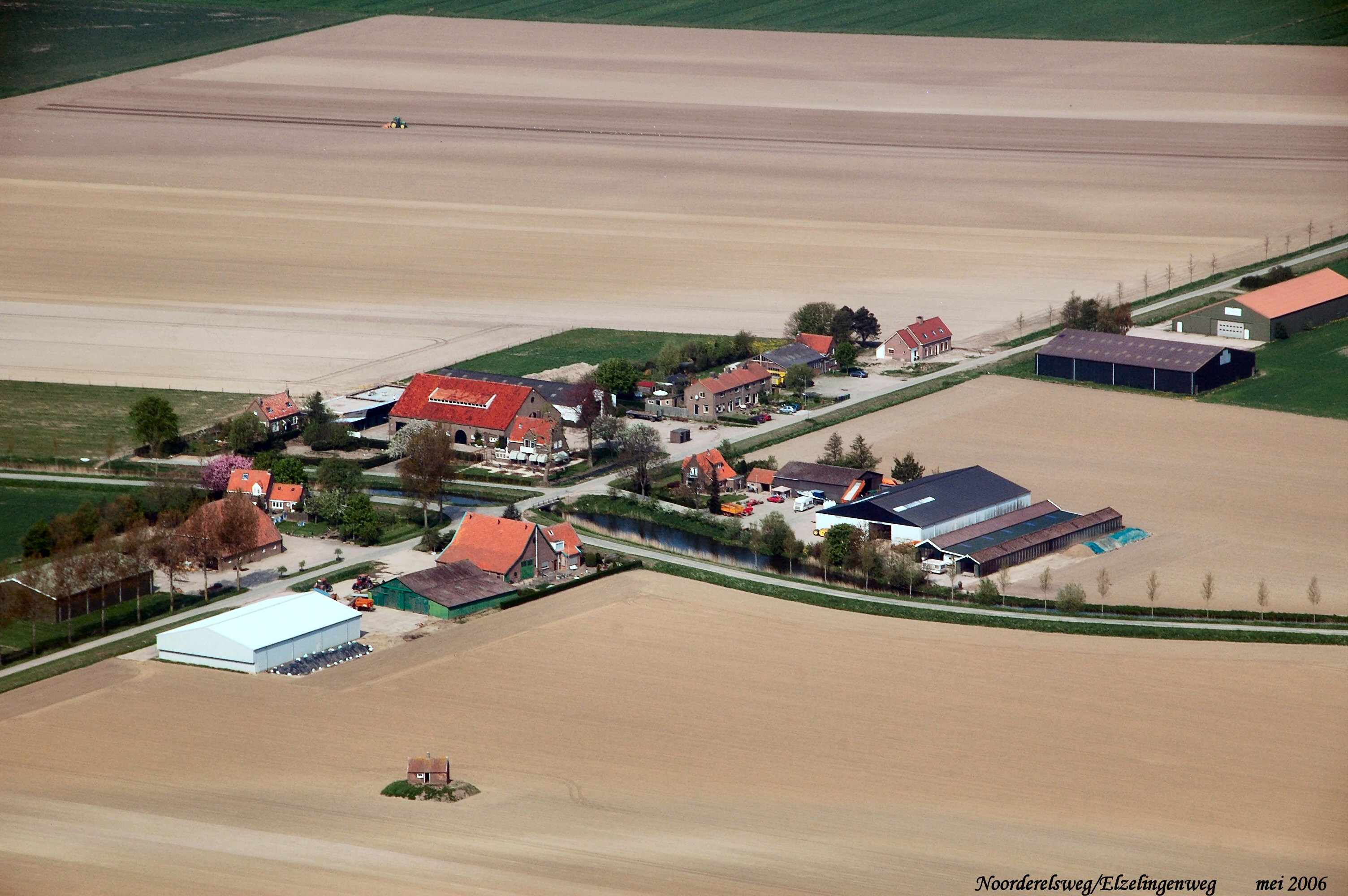 Noorderelsweg met de Van Elzelingenweg en 4 boerderijen. gezien in Noord/Westelijke richting.