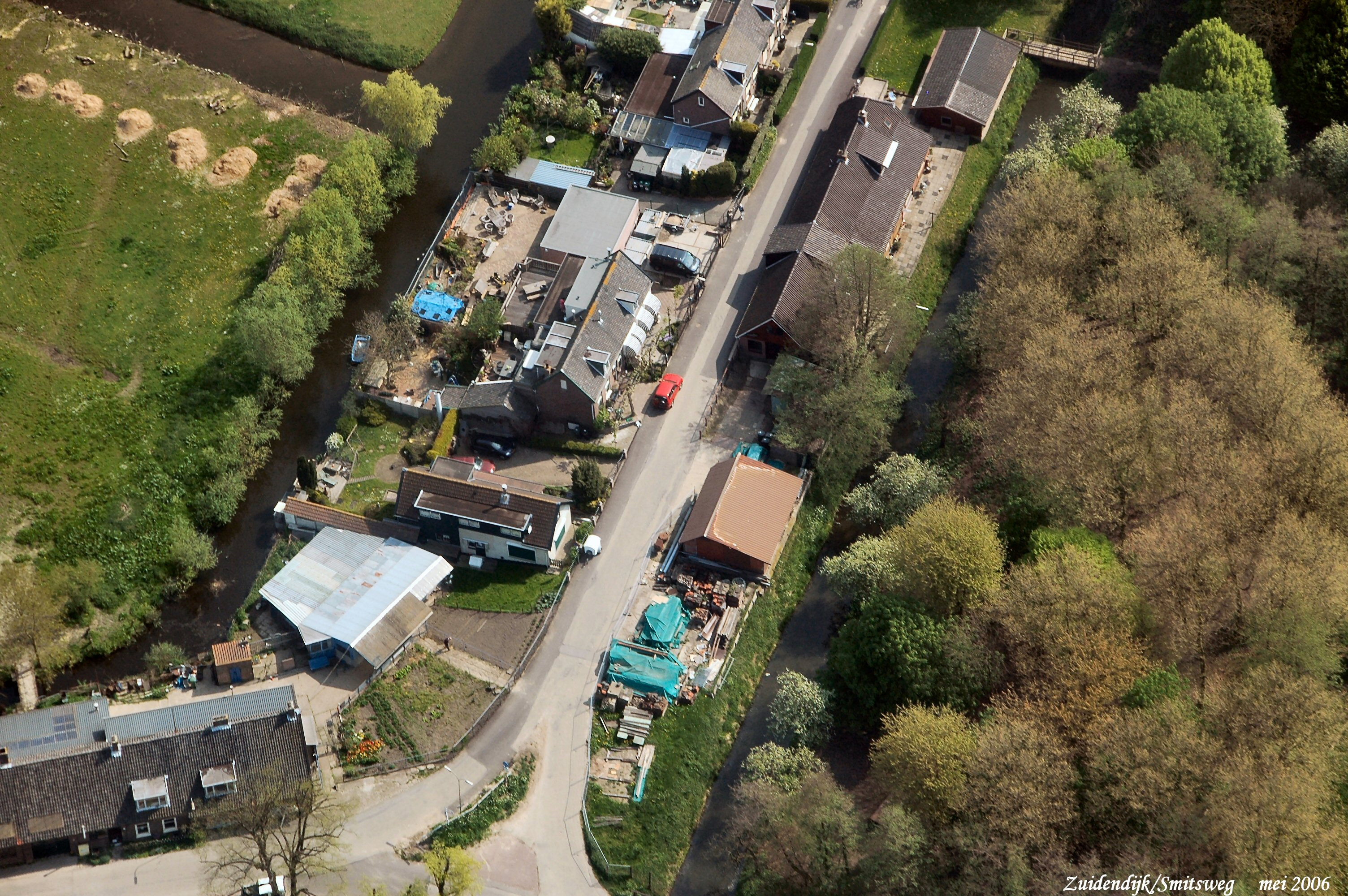 Smitshoek-Zuidendijk met links onder nog de smederij van Verschoor welke is gesloopt voor bouw van Appartementen in 2018. gezien in Noord/oostelijke richting.