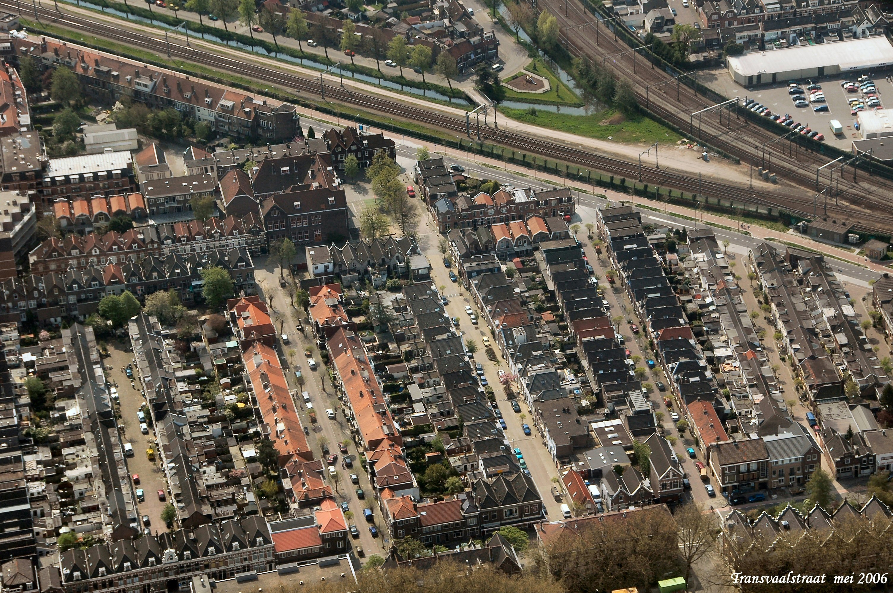 Links boven naar rechts is de Transvaalstraat met het spoor Dordrecht-Gorkum.rechts onder is de Toulonselaan gezien in Zuidelijke richting.