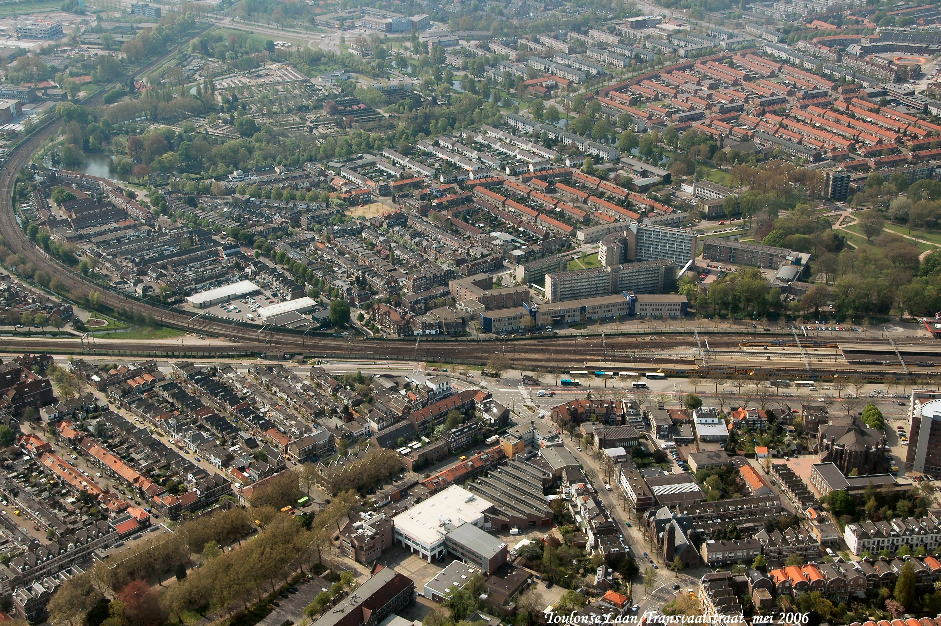 Links onder is de Toulonselaan met rechts onder de Dubbeldamseweg. Mid.links spoorlijn naar Sliedrecht rechts boven Krispijn gezien Zuidelijke richting.