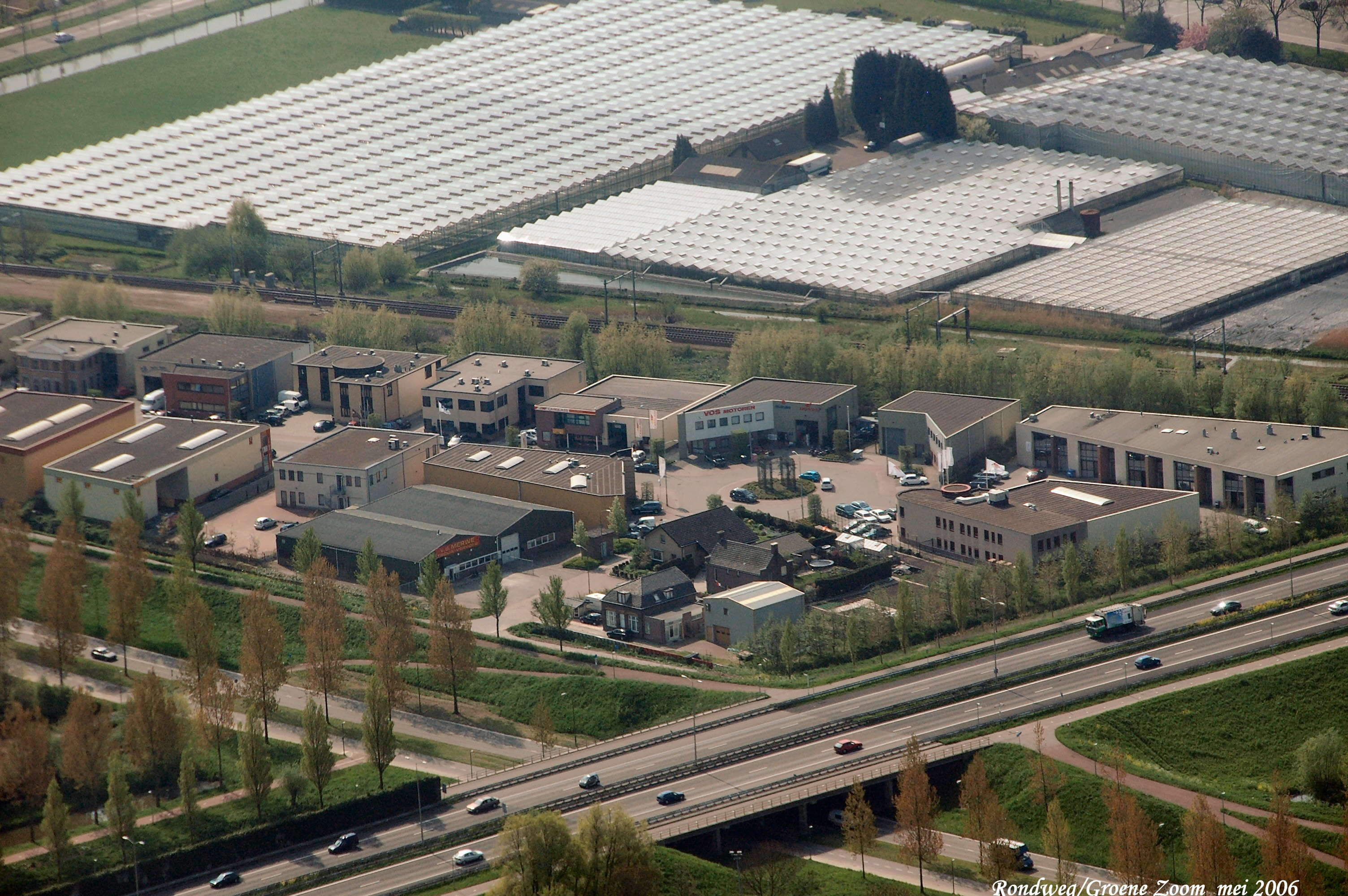 Rechts onder de Groenezoom met de Rondweg er over.In het midden de Jan Valsterweg met de spoorlijn Dordrecht-Sliedrecht er boven. Voormalig kassen komplex van Fam. v de Merwe. gezien in Zuid/Oostelijke richting.