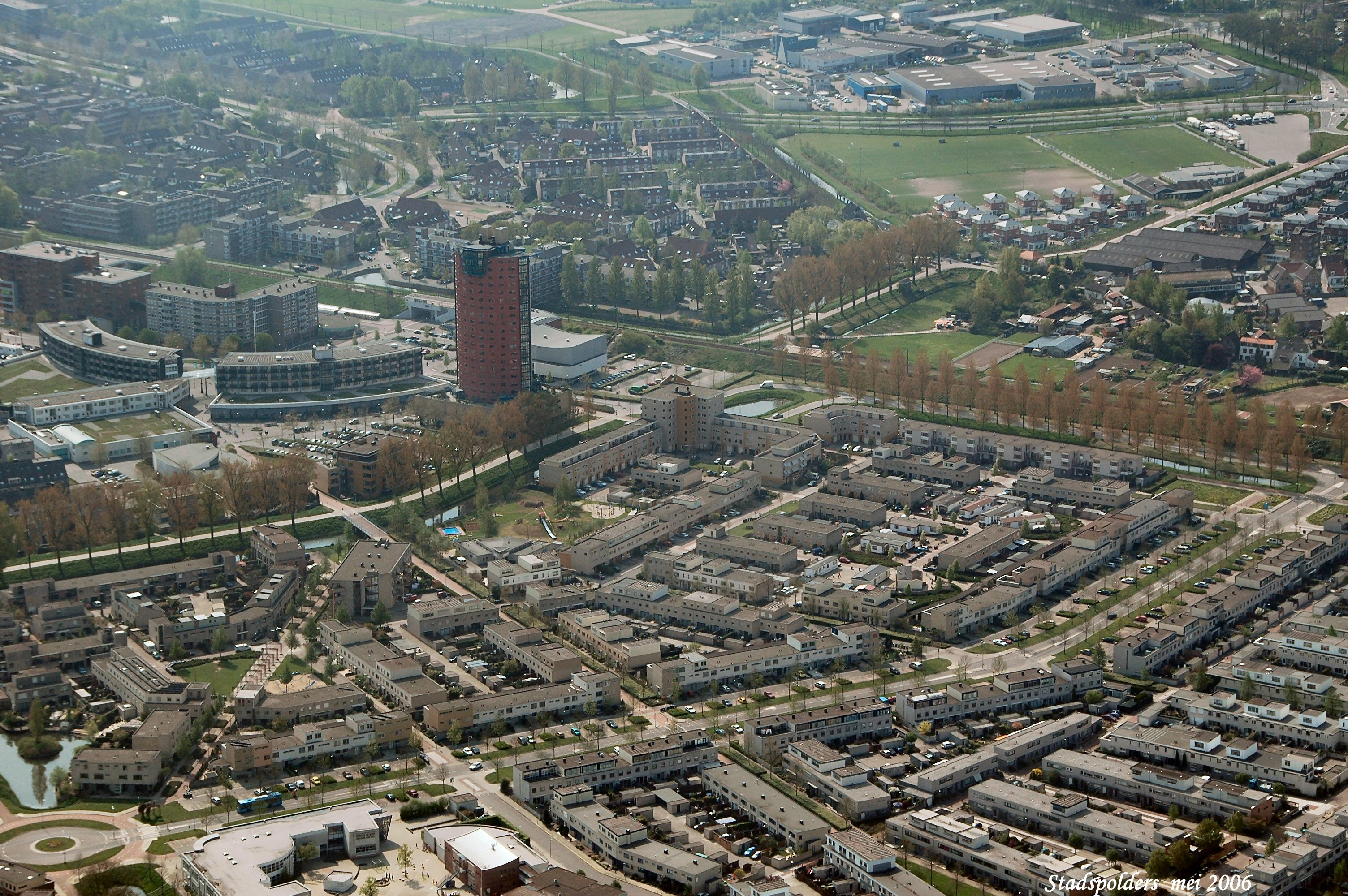 Stadspolder met de Sequoia en links er van winkelcentrum "Bieshof" Mid.links is de Loswalweg Rechts boven is de Egstraat met van links naar rechts de spoorlijn Dordrecht Sliedrecht. gezien in Zuid/Oostelijke richting.