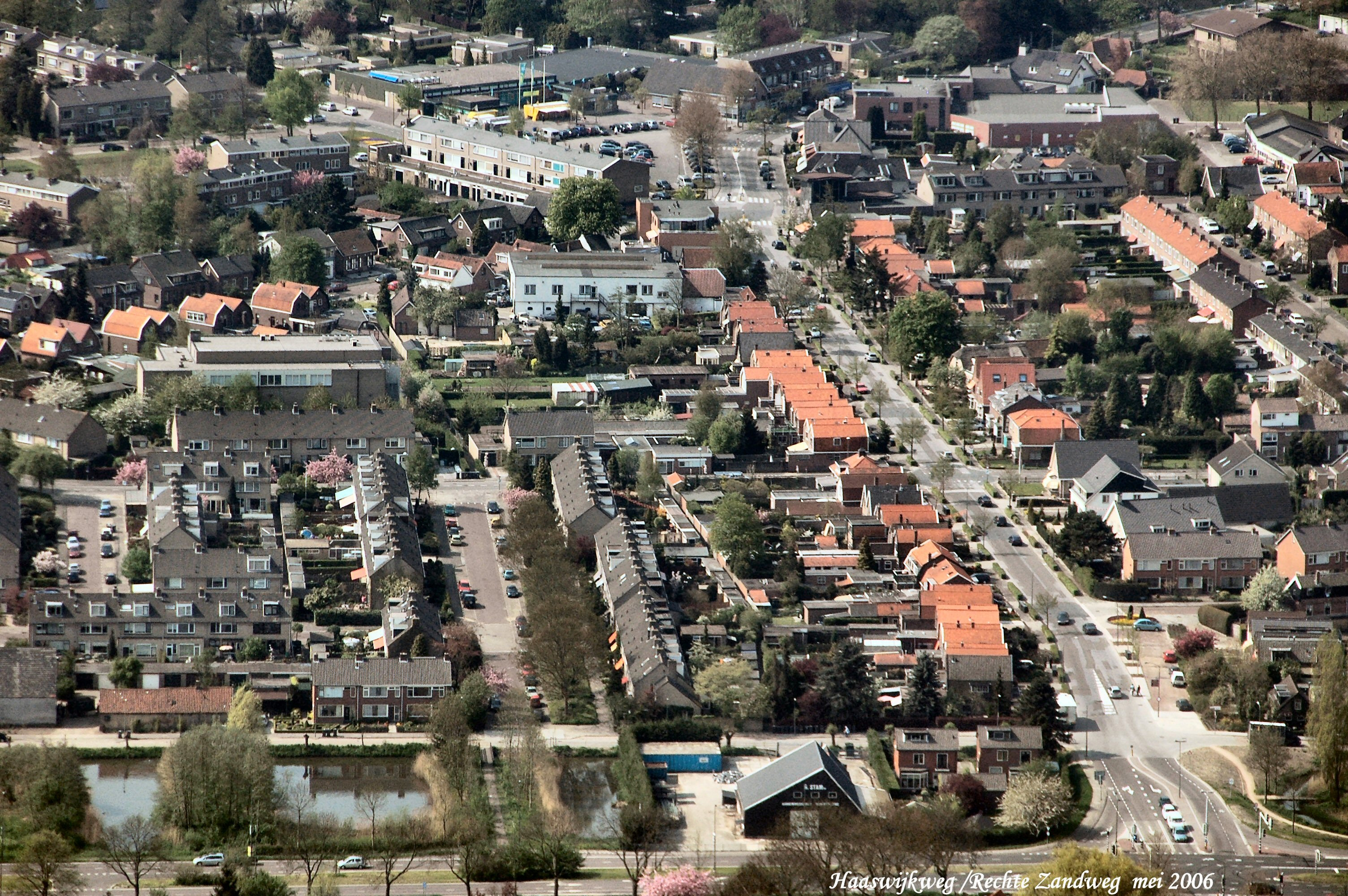 Geheel onder is de Provincialeweg met de Haaswijkweg Oost er boven. rechts is de Rechte Zandweg met mid.boven het Damplein. gezien in Zuidelijke richting.
