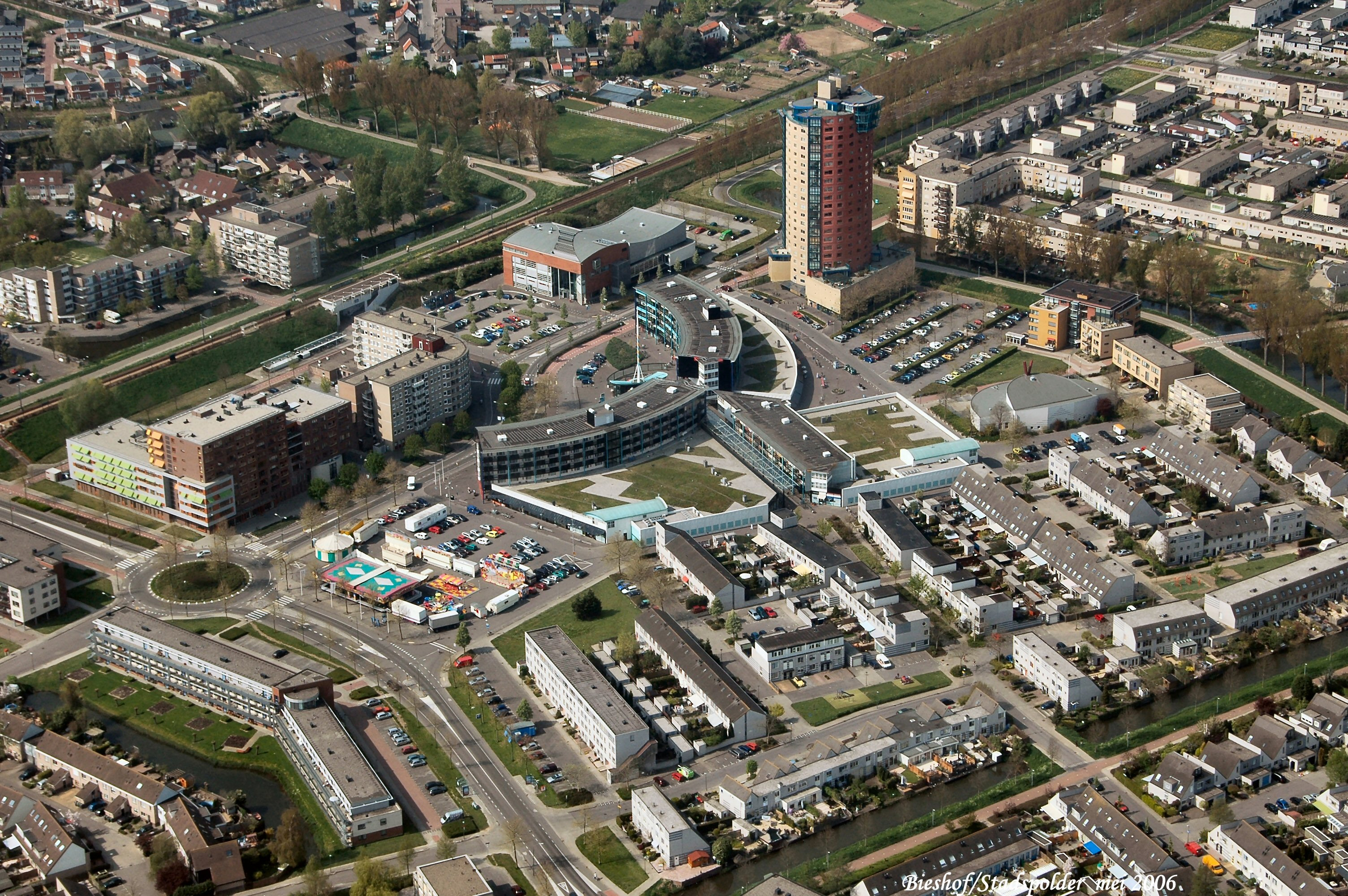 Winkelcentrum Bieshof in de Stadspolder met rechts de Sequoia gezien in Zuid/Westelijke richting.
