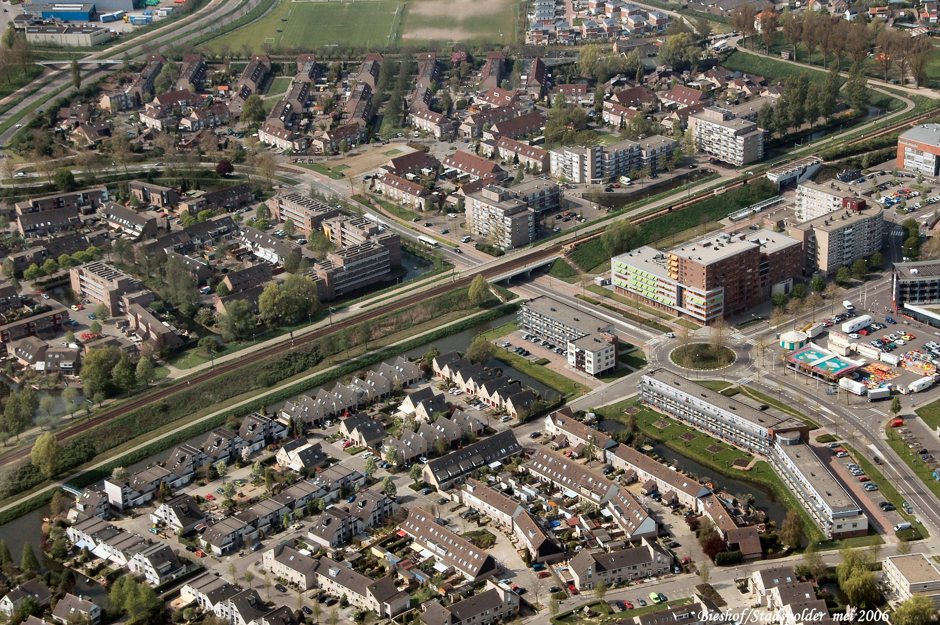Mid.rechts het winkelcentrum Bieshof in de Stadspolder. met de spoorlijn Dordrecht-Sliedrecht. rechts boven is de Loswalweg.boven van links naar rechts is de Noordendijk gezien in Zuid/Westelijke richting.