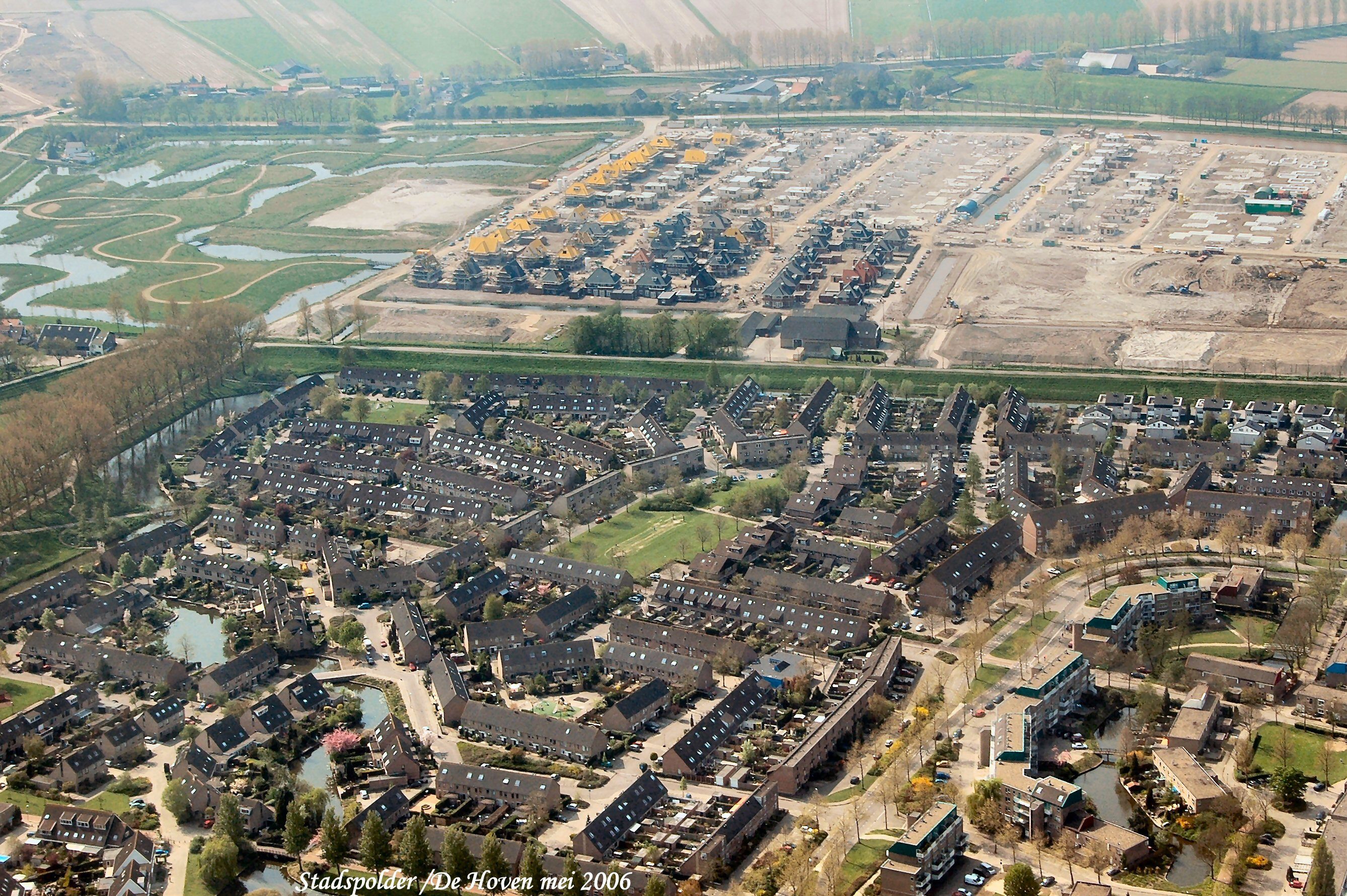 Onder is de Stadspolder met de Hoven in aanbouw er boven. mid.links is de Bildersteeg. in het midden van links naar rechts is de Noordendijk. geheel boven is de Provincialeweg gezien in Zuidelijke richting.