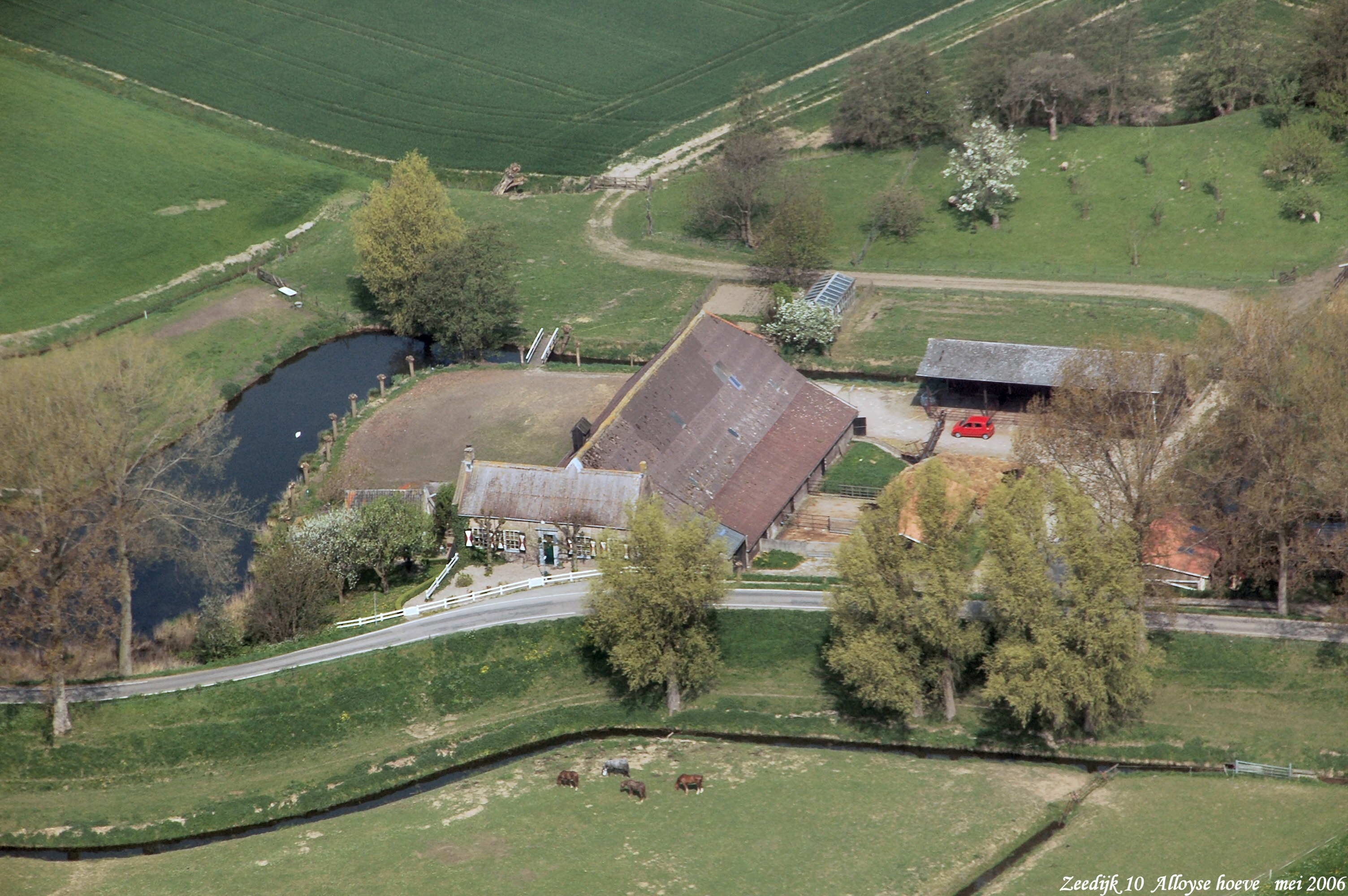 Zeedijk 11 Alloyse Hoeve gebouwd 1660/1670, bewoner was toen Burgemeester Brandeler. Het wiel links is van een oude dijkdoorbraak in 1682.