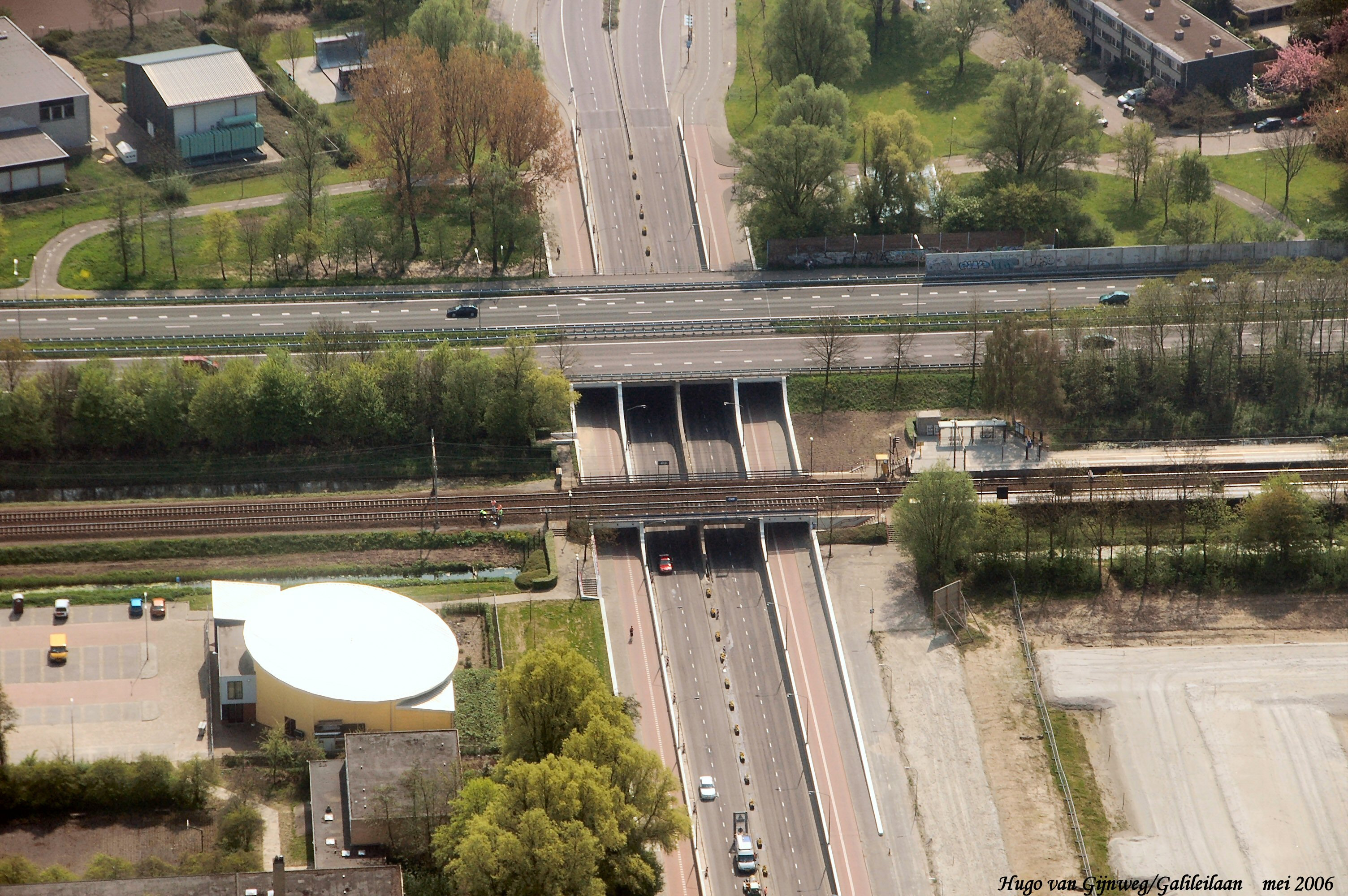 Mid.onder naar boven is de Galileilaan met de tunnel onder het spoor en de Rondweg/ N3 door, onder is Crabbehoff met Sterrenburg er boven.gezien in Oostelijke richting.