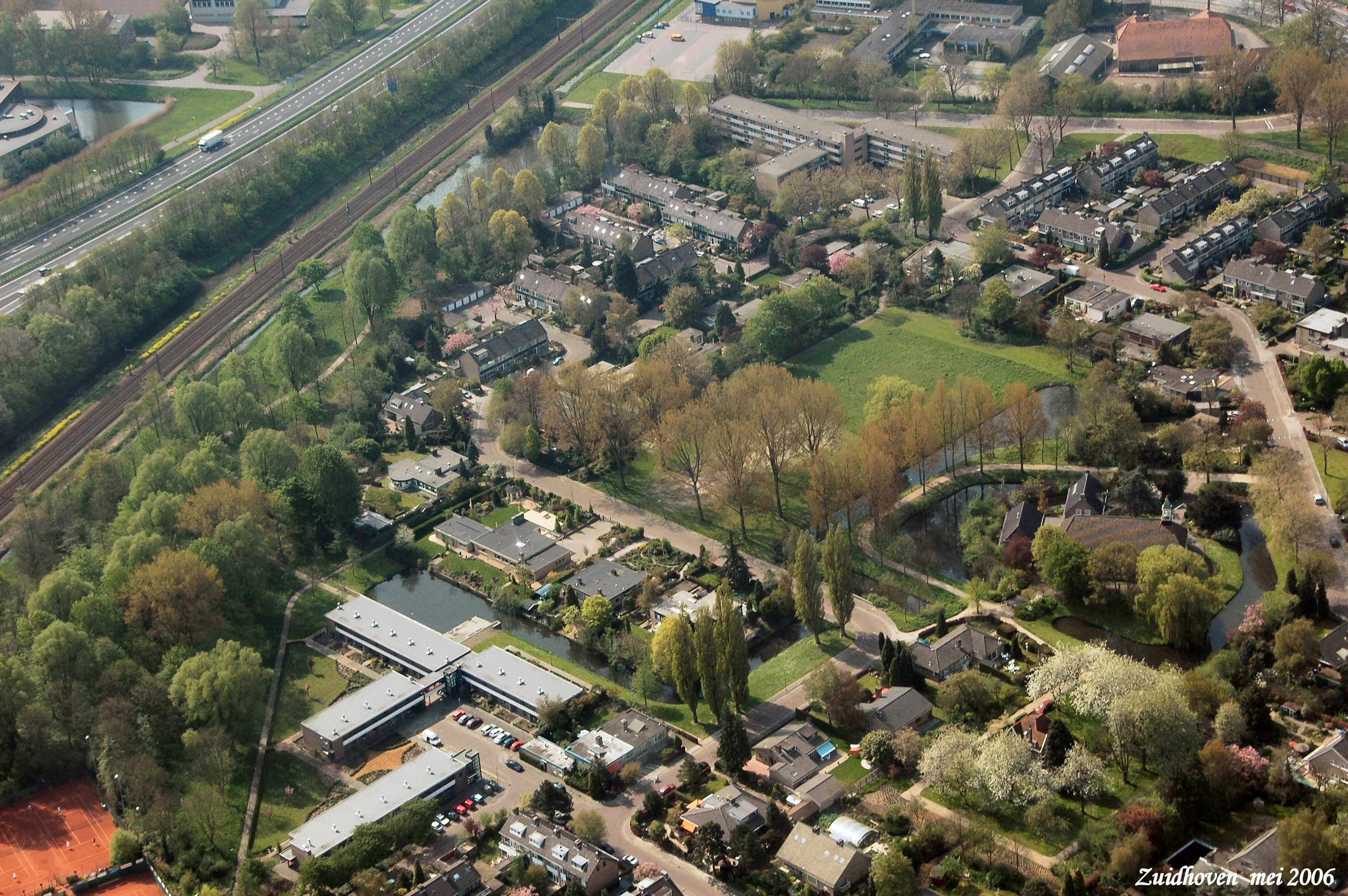 Zuidhoven met links de Rondweg en spoorlijn Dordrecht-Breda. Rechts boven is de Spirea met de Manege. links onder is tennisver. D.L.T.C. Dash '35. gezien in Zuidelijke richting.