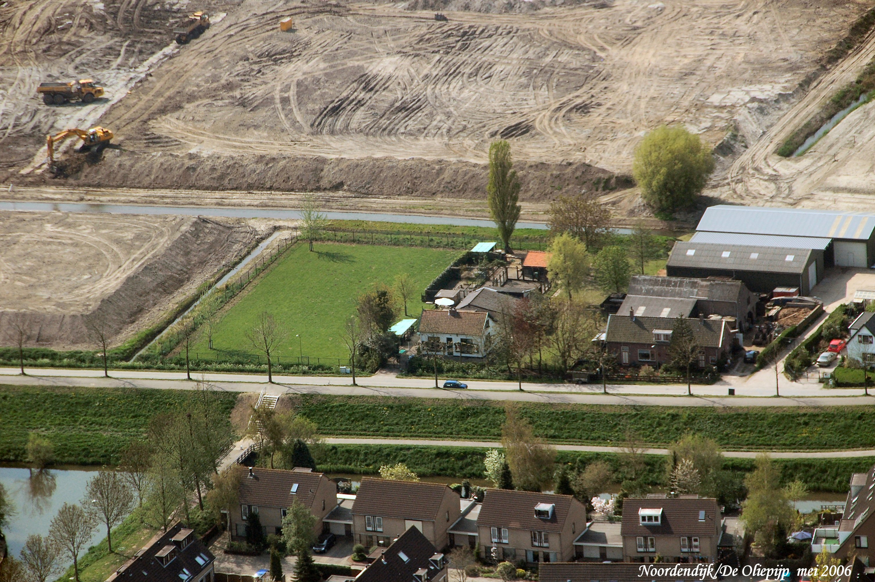In het midden is de Noordendijk met de Oliepijp er boven. onder is het Frida Katz-erf in de Stadspolder. boven is nu de Hoven gezien in Zuidelijke richting.