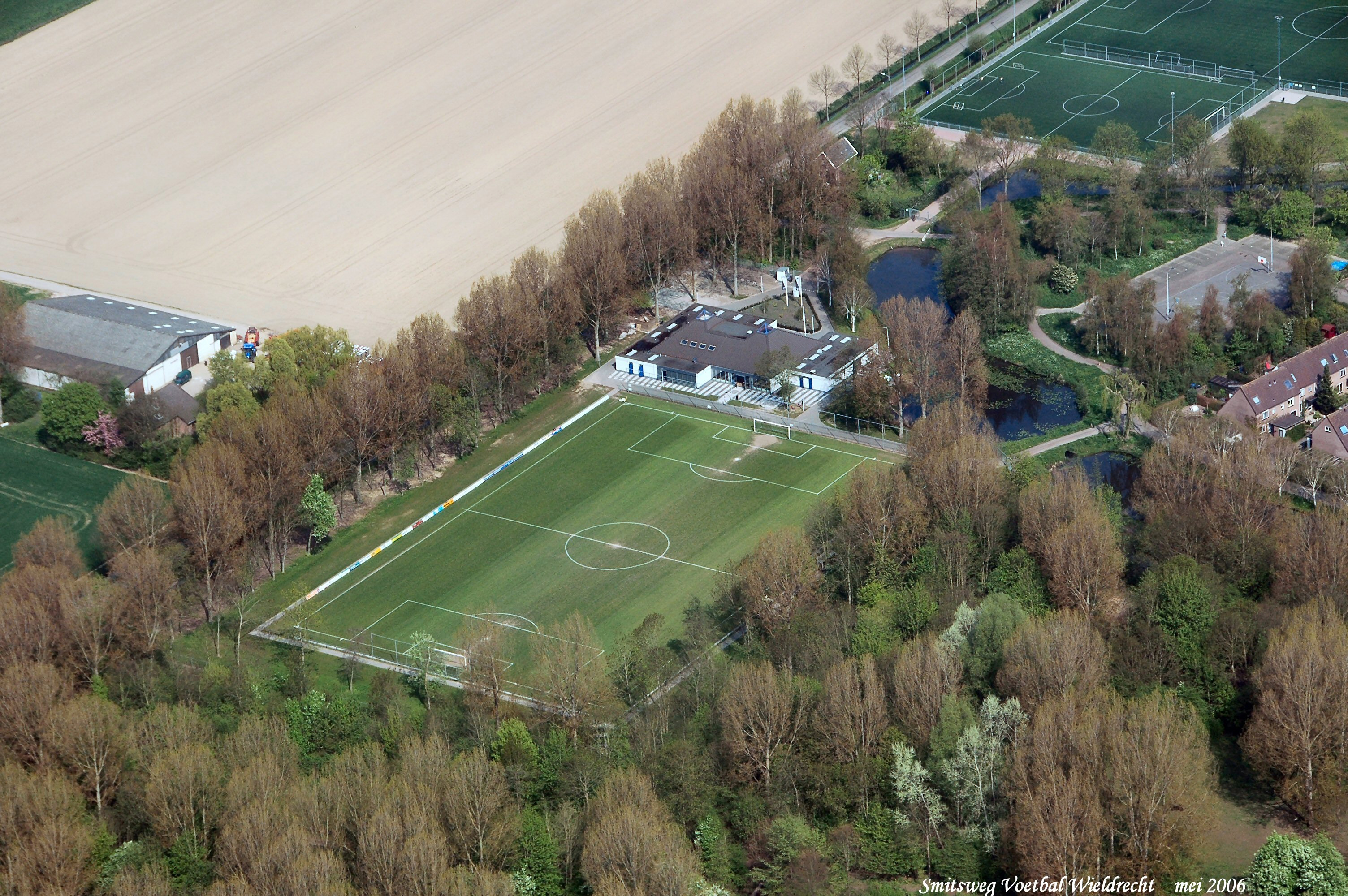 Voetbalveld van V.V. Wieldrecht aan de Smitsweg. mid.links is de Jacomarans Hoeve. gezien in Noordelijke richting