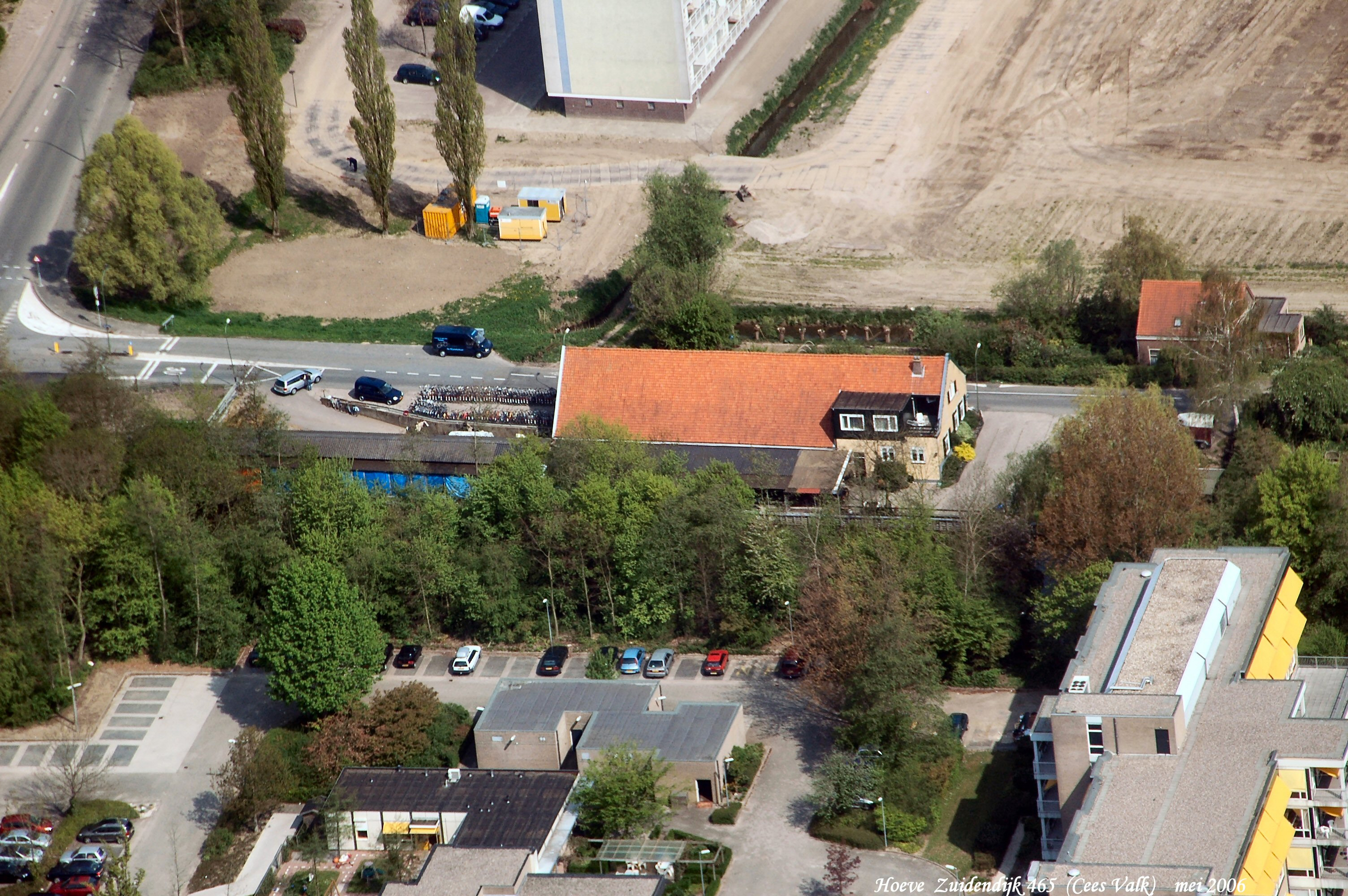 Zuidendijk met links boven de Leeuwestraat. onder is de Sterrenlanden, in het midden boerderij Zuidendijk 465 gebouwd in 1885. In 1903 betrok Fam. in t"Veld de boerderij. 1924 fam.van der Stel die het in 1926 weer verkocht aan Dirk Schenk. 1982 wer Kees Valk de nieuwe bewoner. gezien in Noordelijke richting.