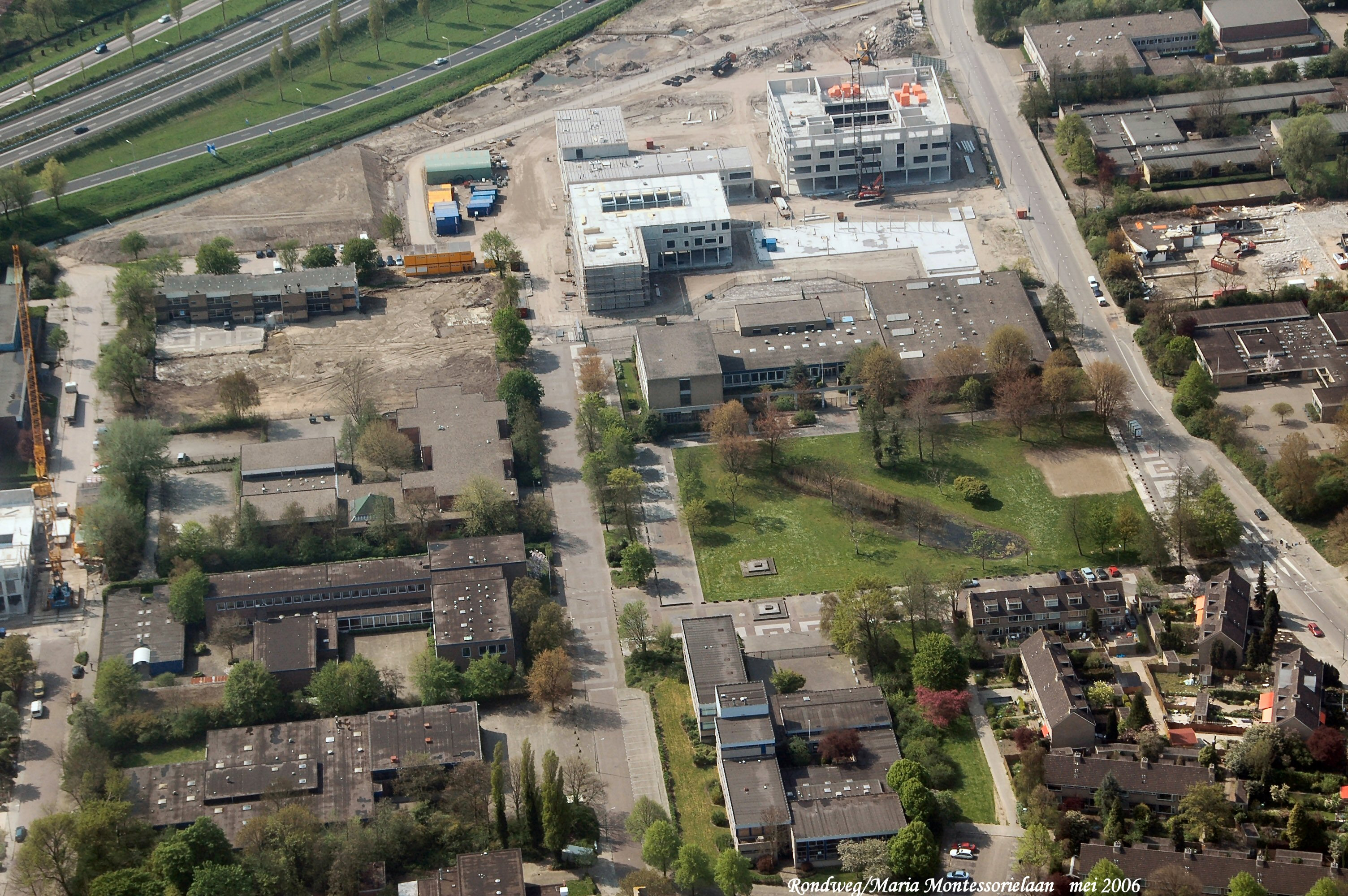 Links boven is de Rondweg met rechts de Maria Montessorilaan rechts.