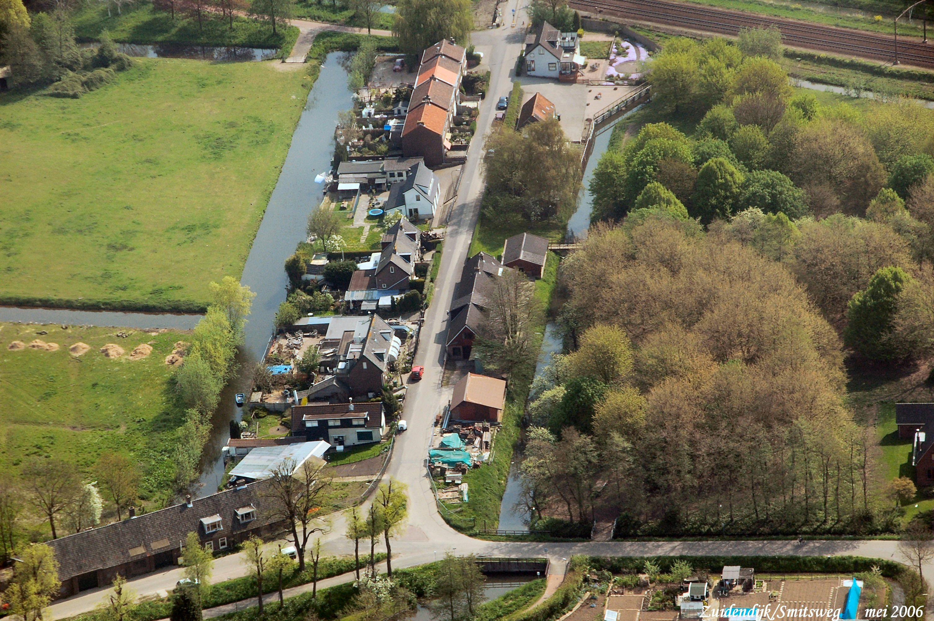 Links onder is Smitshoek met de voormalige smederij van Verschoor. rechts onder is de Smitsweg en de Zuidendijk naar boven. rechts het spoor van Dordrecht naar Breda gezien in Oostelijke richting.