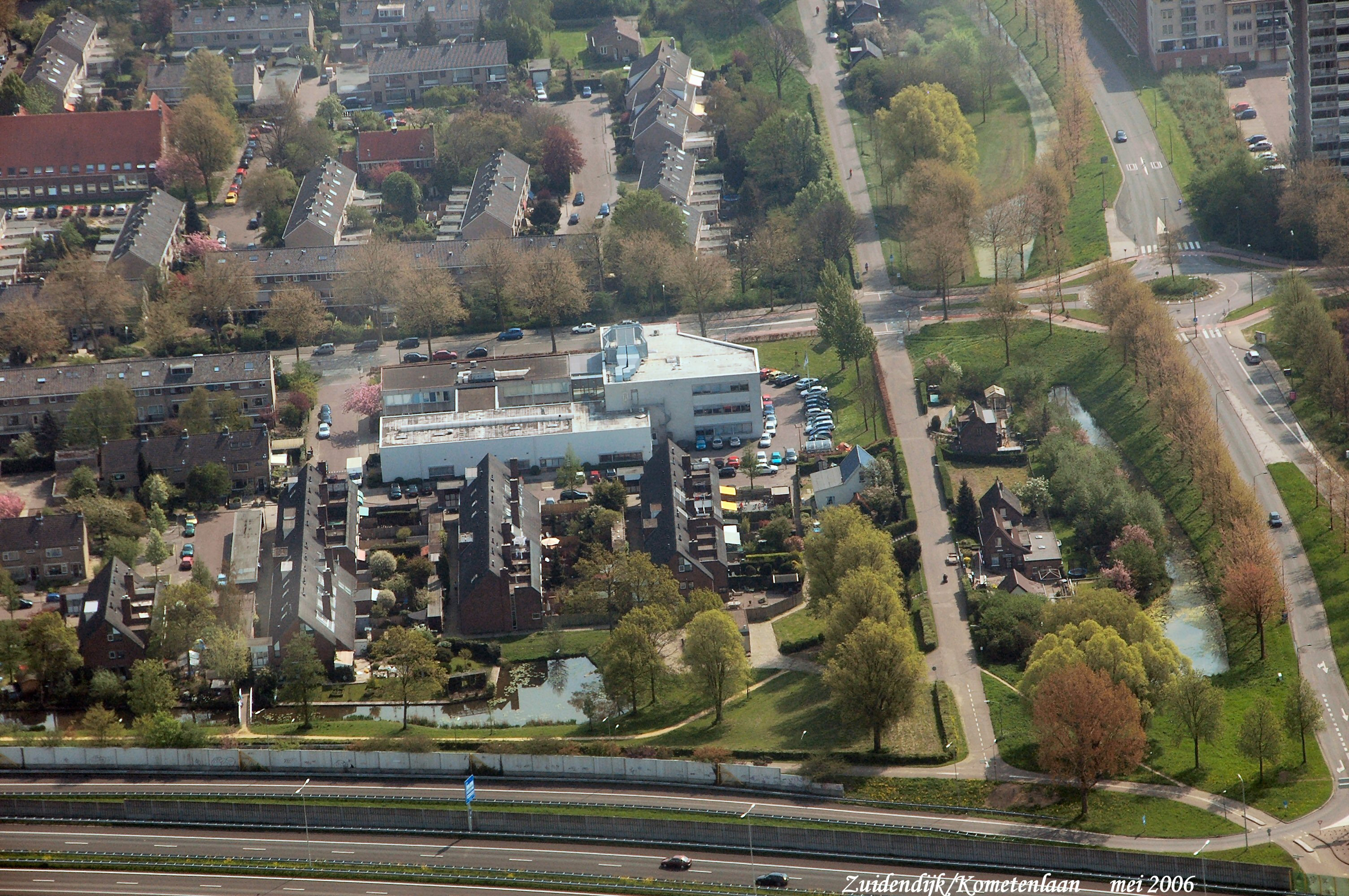Onder is de Rondweg met rechts de Copernicusweg. links er van is de Zuidendijk. Mid.links naar rechts is de Kometenlaan gezien in Oostelijke richting.