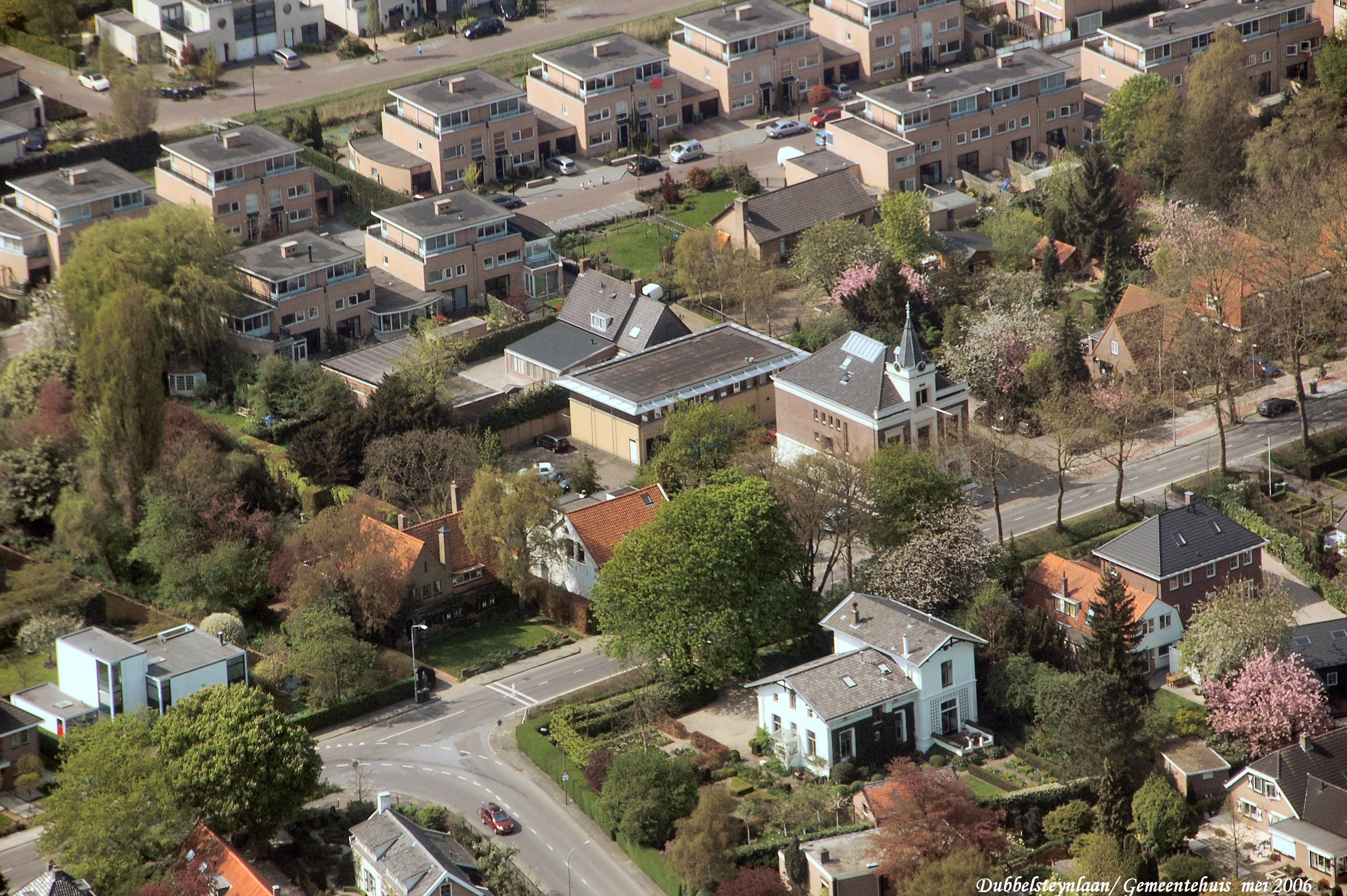 Links onder is de Groene Kruislaan met de voormalige dokters woning van Dr.Gundel.In het midden is de Dubbelsteynlaan met het oude Gemeentehuis van Dubbeldam.. boven is het Beelaertspark gezien in Zuid/Westelijke richting.