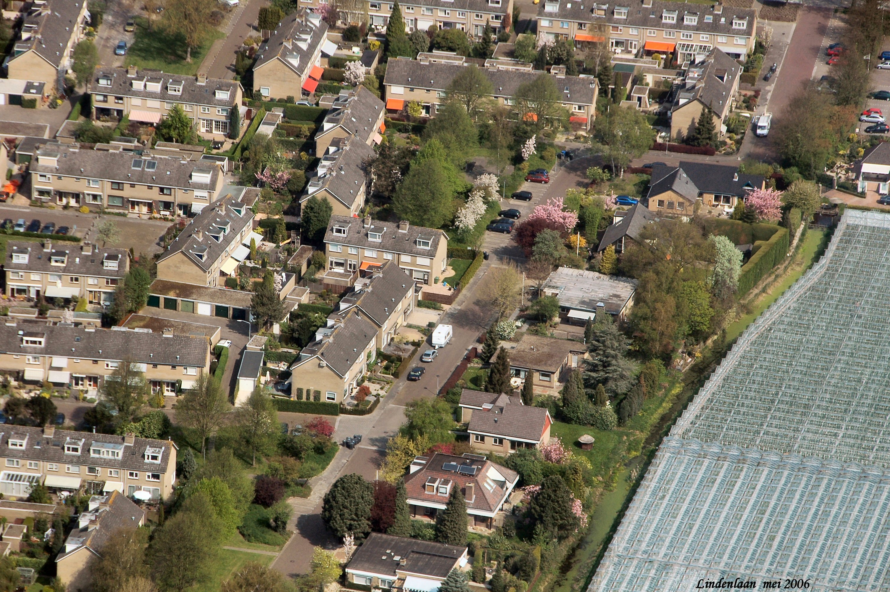 Rechts is de Lindelaan met rechts boven de ingang van Tuincentrum Pap, (inmiddels afgebroken voor woningen). gezien in Noordelijke richting.