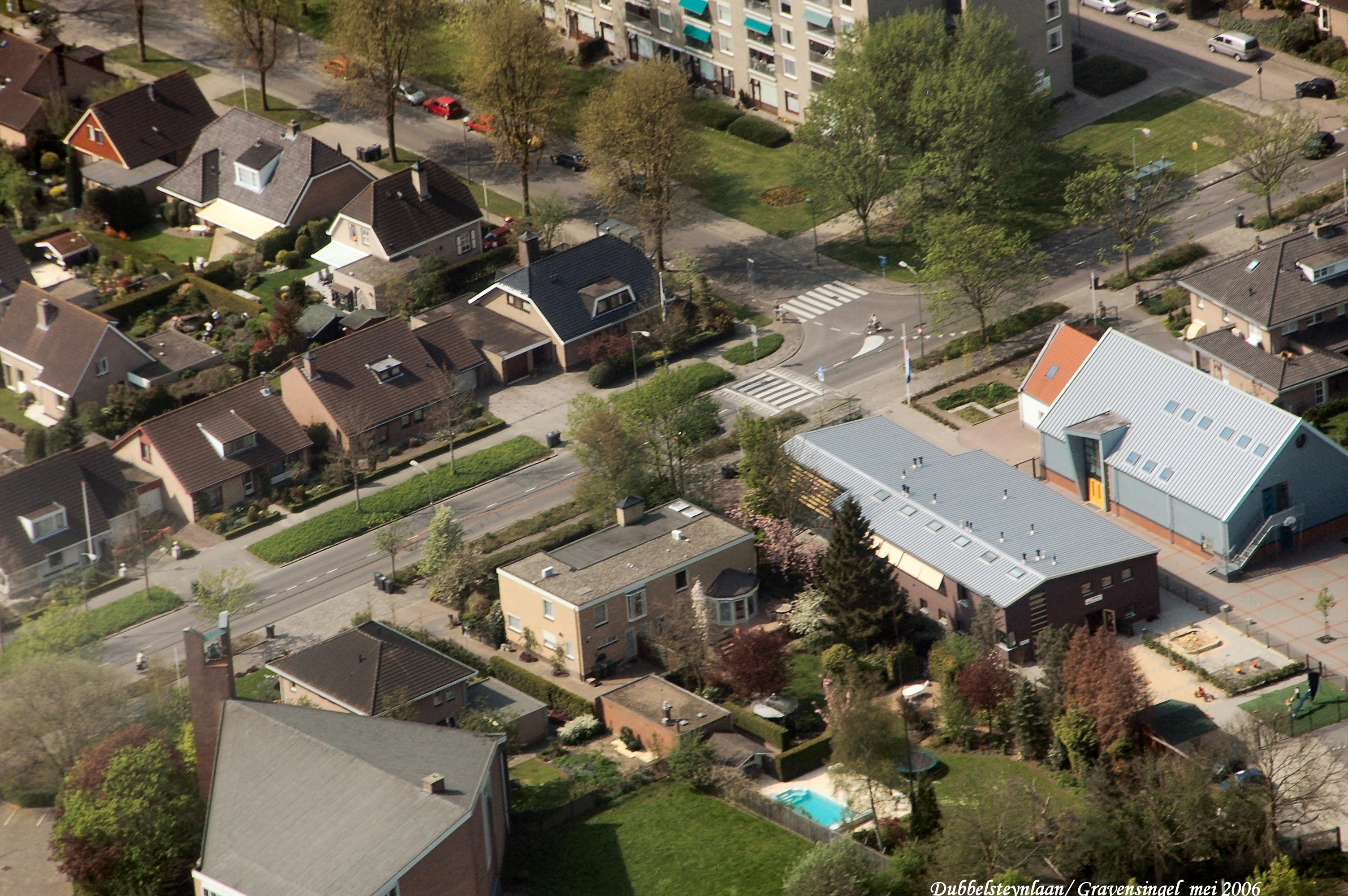 Dubbelsteynlaan met links boven de Gravensingel. mid.boven is Gravenhorst en links onder de hervormde Kerk.gezien in Zuid/Westelijke richting.