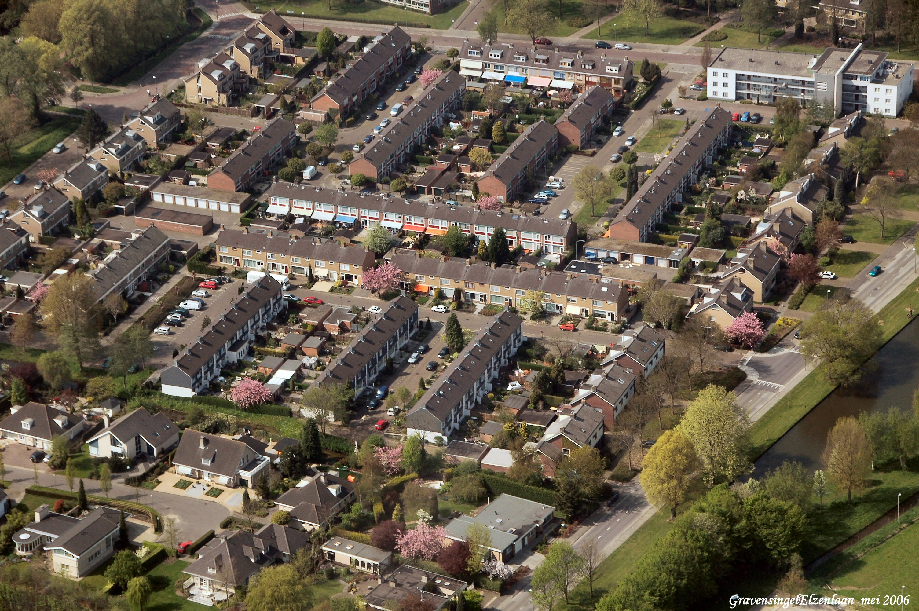 Rechts onder is de Gravensingel met boven de Elzenlaan. links boven is de Iepenlaan met de toegang naar Middenhoeve gezien in Zuidelijke richting.