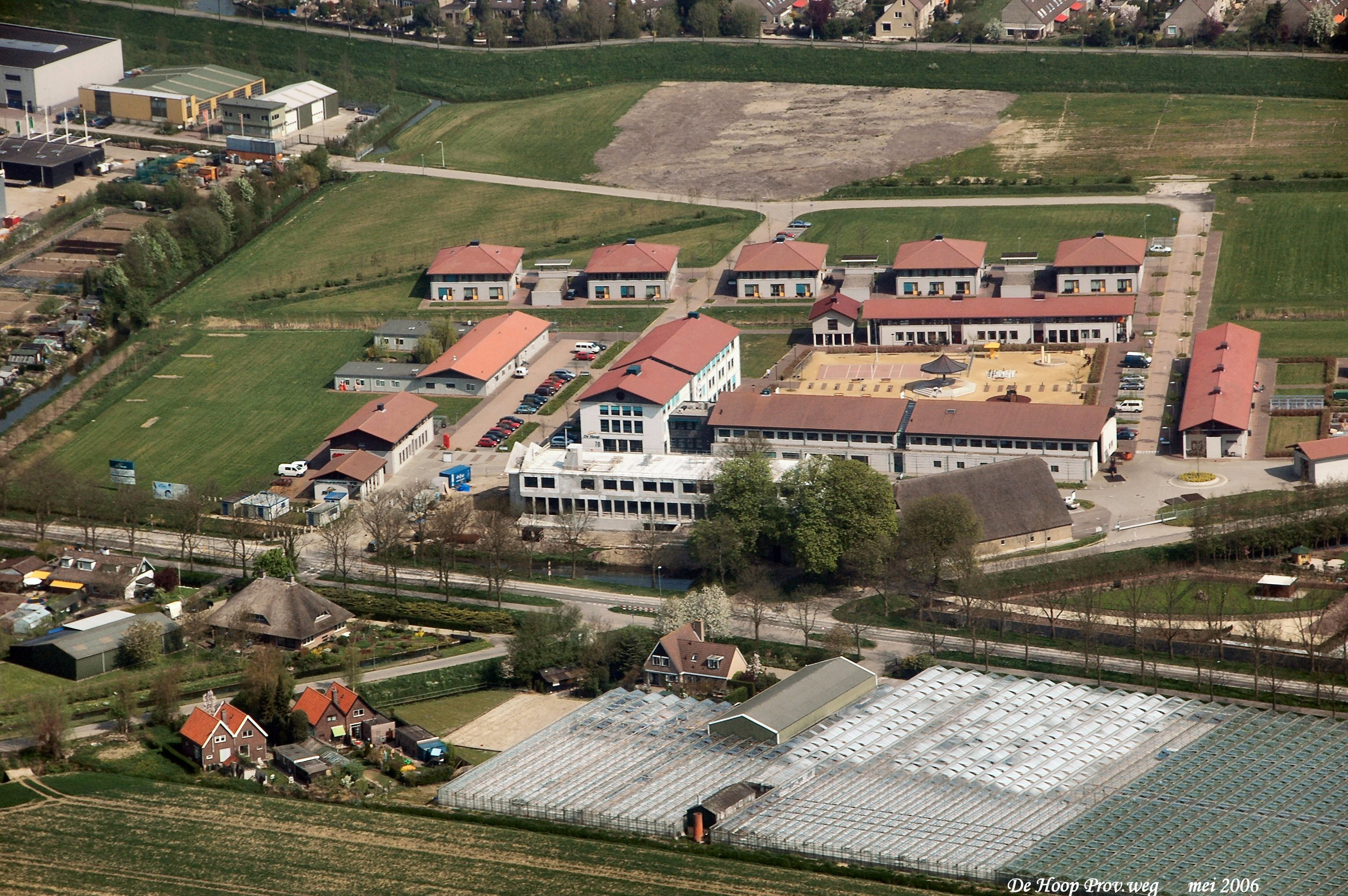 Onder de voormalige kassen van Schotman met links onder de Oudendijk. mid.links naar rechts is de Provincialeweg met Stichting "De Hoop" er boven. geheel boven is de Noordendijk gezien in Noordelijke richting.