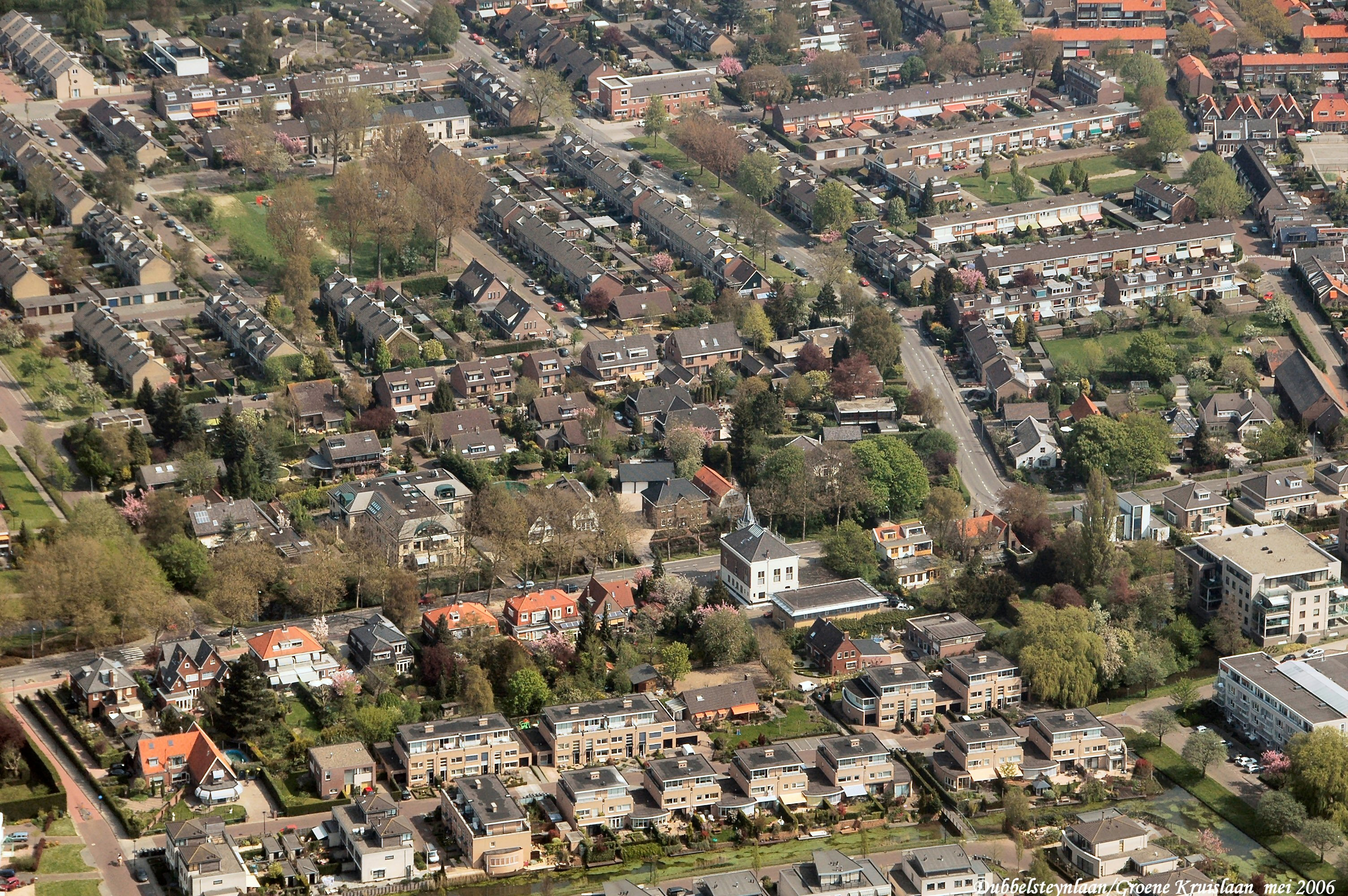 Mid.links naar rechts is de Dubbelsteynlaan met het voormalige Gemeentehuis van Dubbeldam.mid.boven naar onder is de Groene Kruislaan.onder is het Beelaertspark gezien in Noordelijke richting.