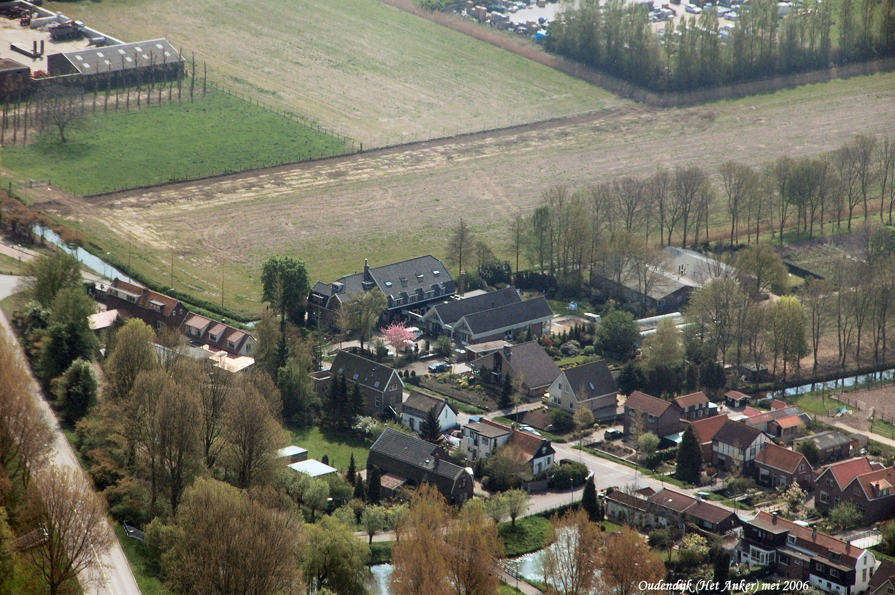 Oudendijk met in het midden voormalige boerderij Valkenhof, welke nu in gebruik is bij Stichting "De Hoop" (Het Anker). gezien in Zuid/Oostelijke richting.