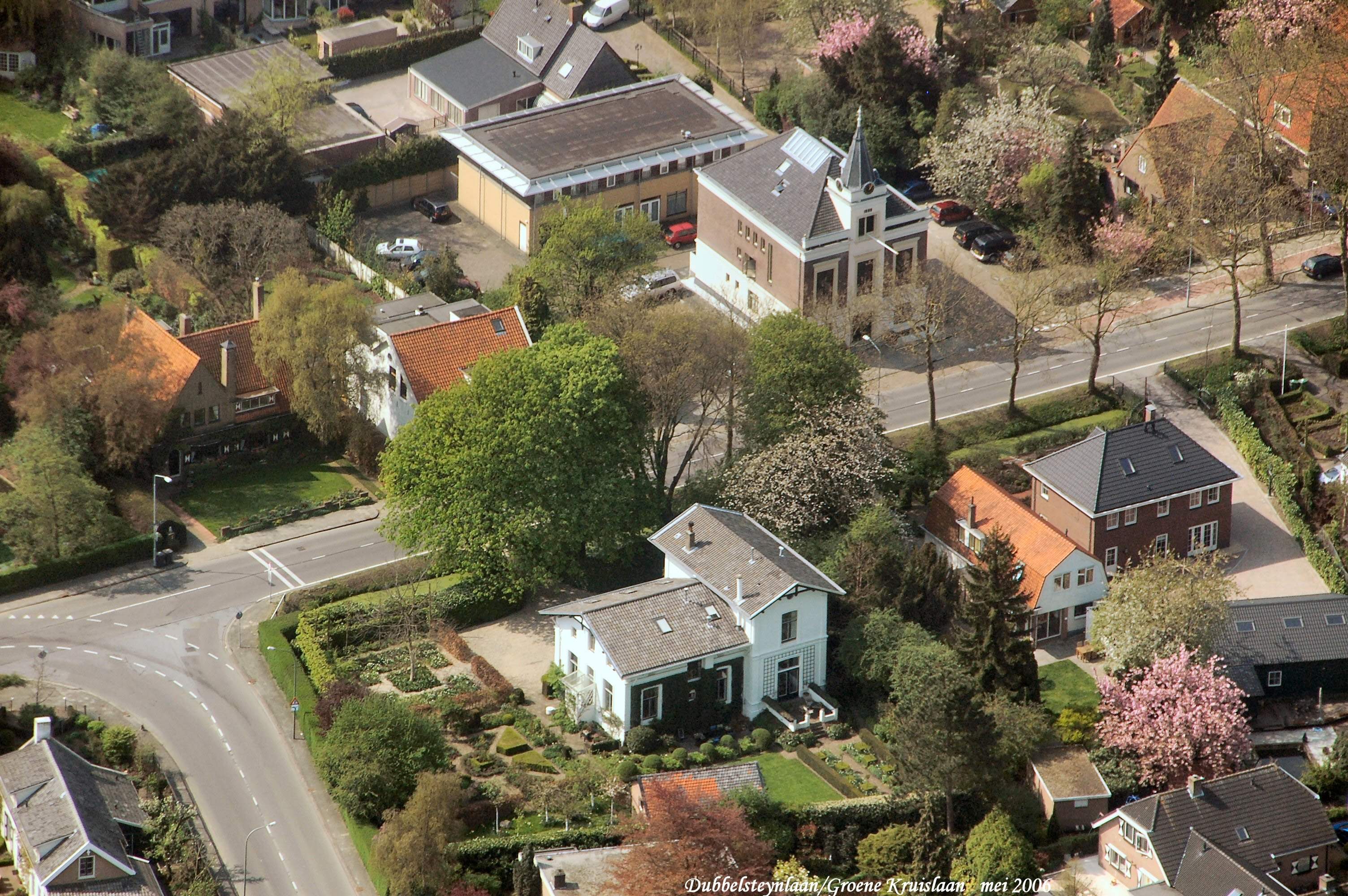 Links onder is de Groene Kruislaan met van links naar rechts de Dubbelsteynlaan met mid.boven het voormalige Gemeentehuis van Dubbeldam gezien in Zuid/Westelijke richting.