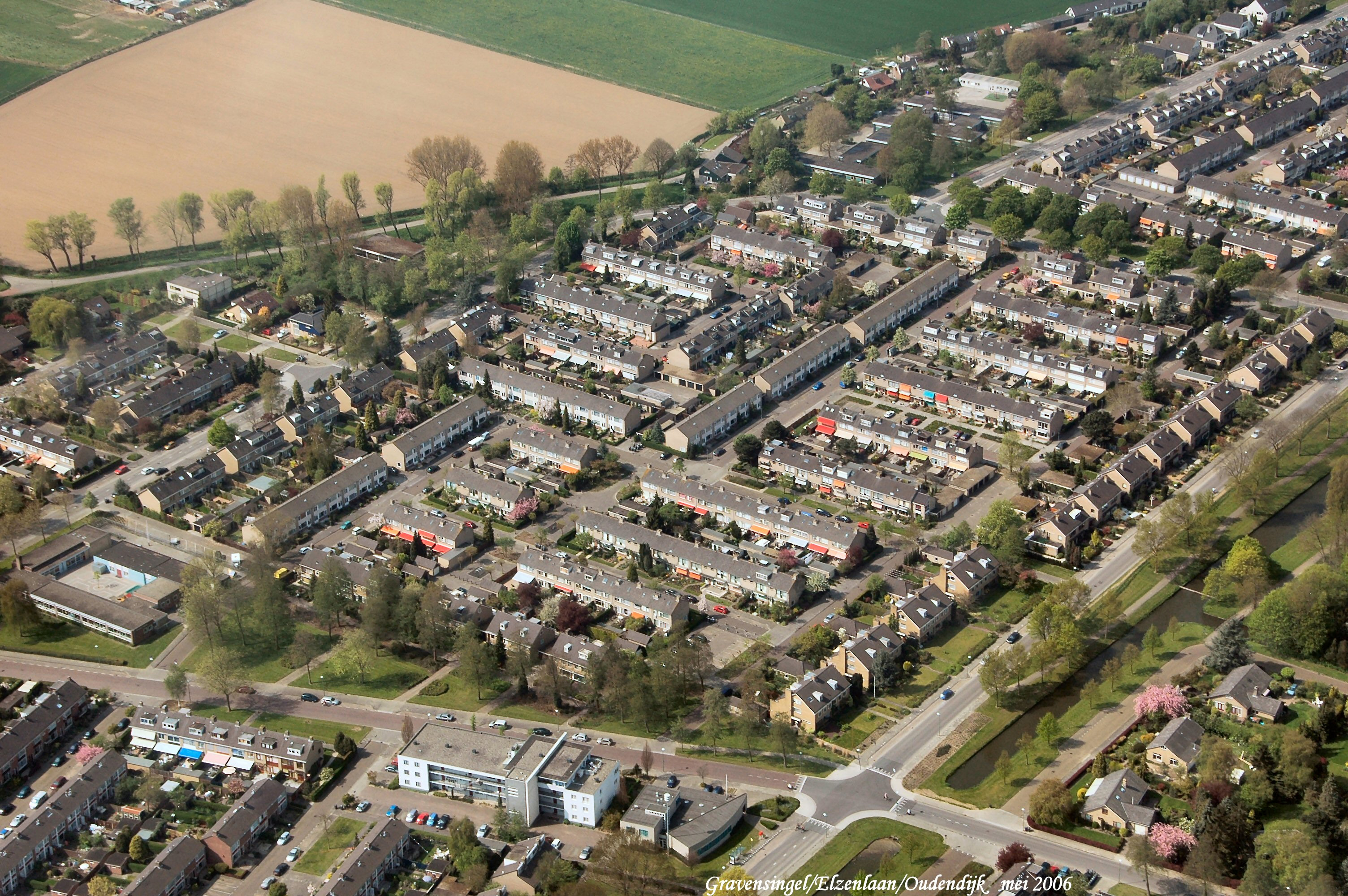 Links boven is de Oudendijk. rechts onder de Gravensingel en onder van links naar rechts is de Elzenlaan gezien in Zuid/Westelijke richting.