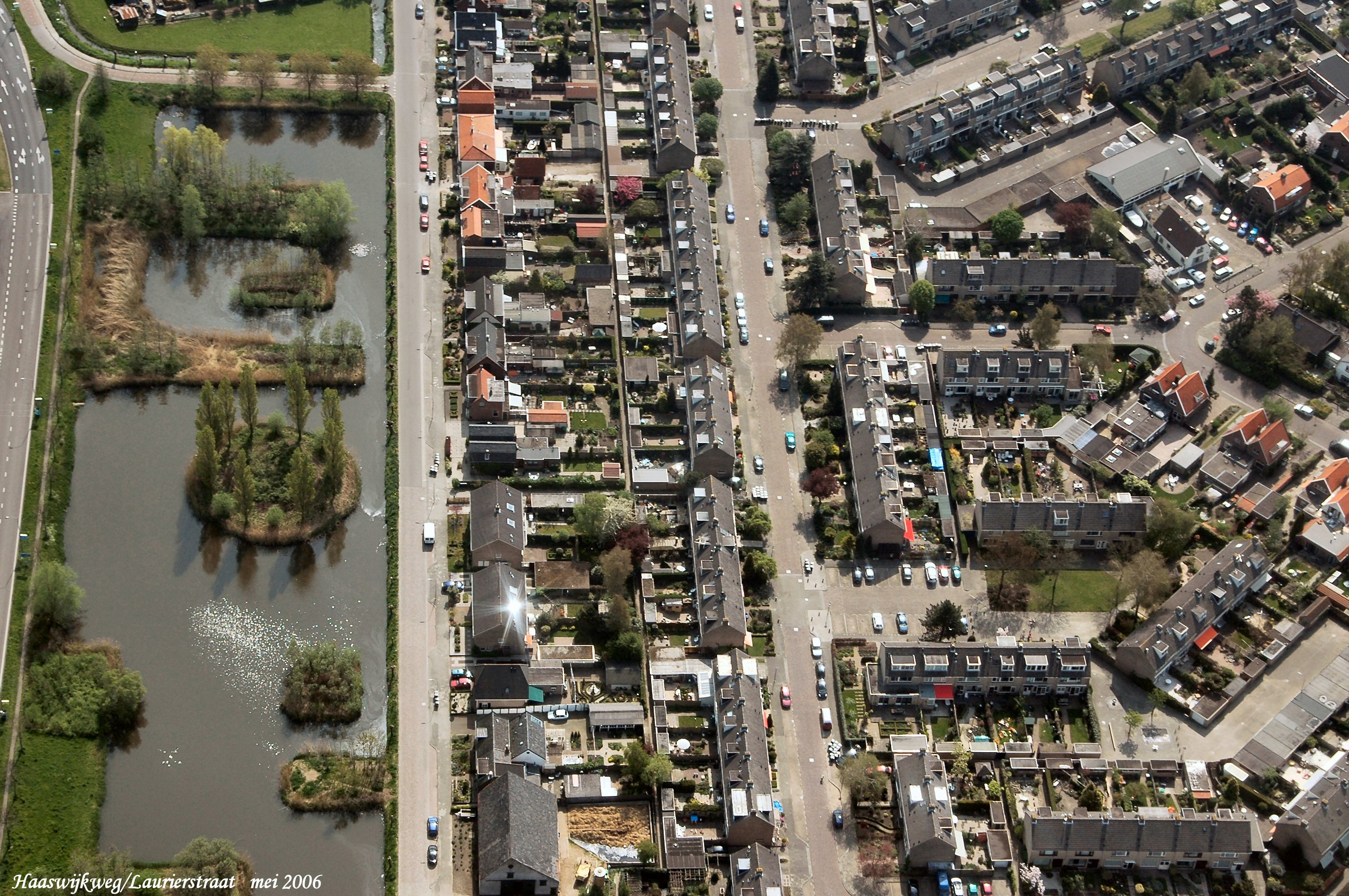 Geheel links nog een stukje van de Provincialeweg met de Haaswijkweg Oost er naast. mid.onder naar boven is de Laurierstraat gezien in Oostelijke richting.