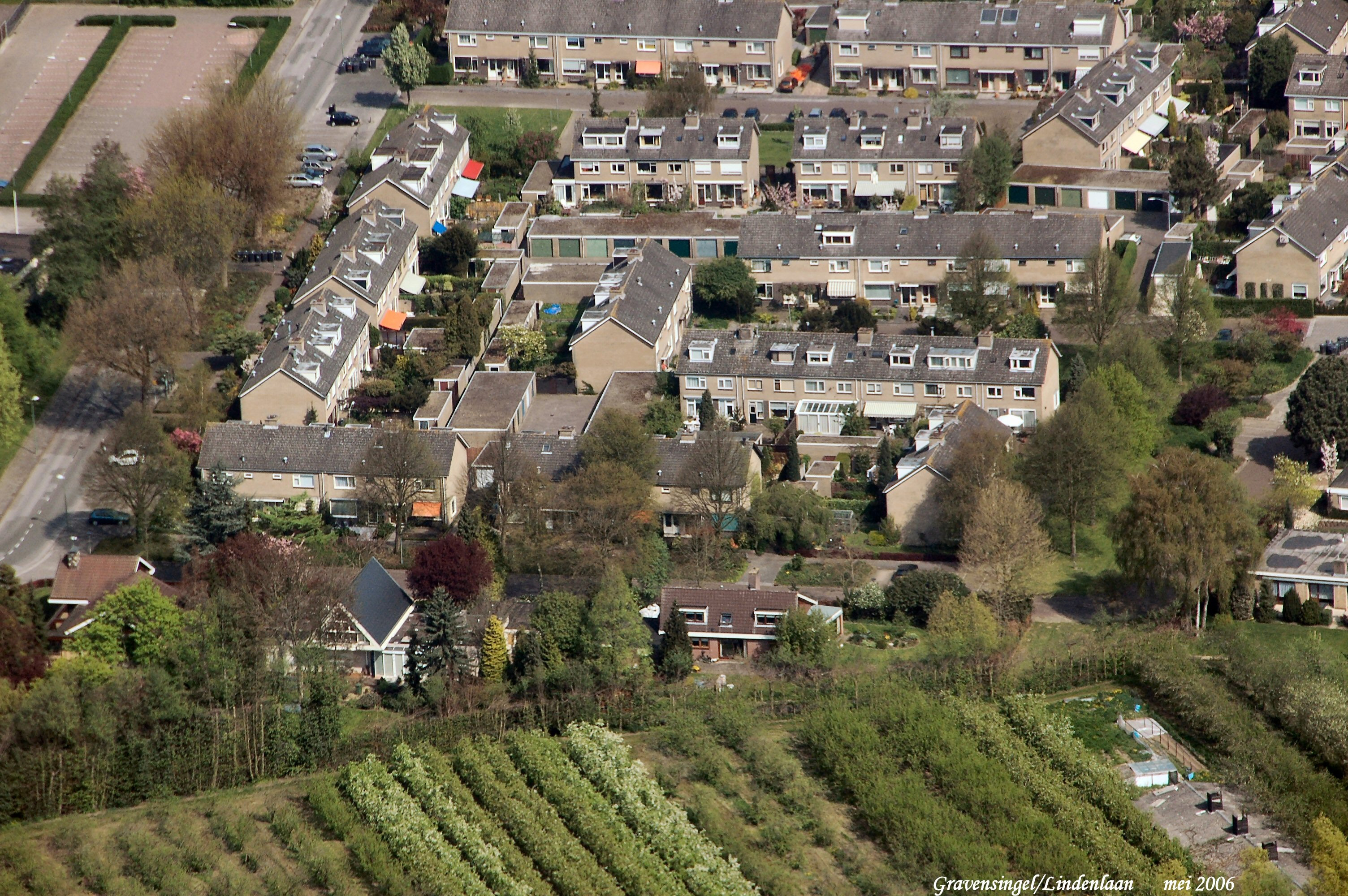 Links boven is de Gravensingel met rechts de Lindenlaan, onder is de voormalige boomgaard van A. Bijl aan de Oudendijk. gezien in Noord/Westelijke richting.