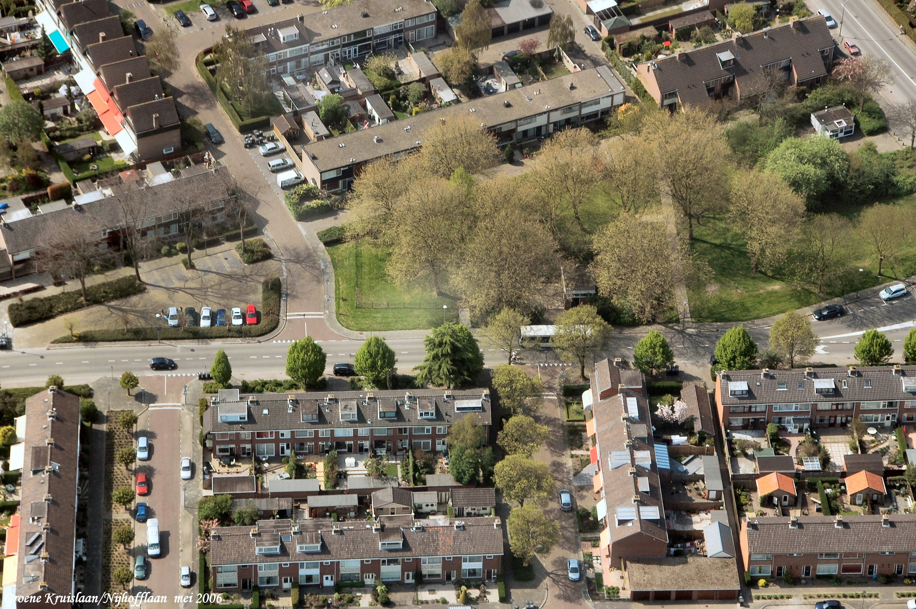 Mid.links naar rechts is de Nijhofflaan. rechts boven is de Groene Kruislaan. links boven is de Heyermansstraat gezien in Zuidelijke richting.