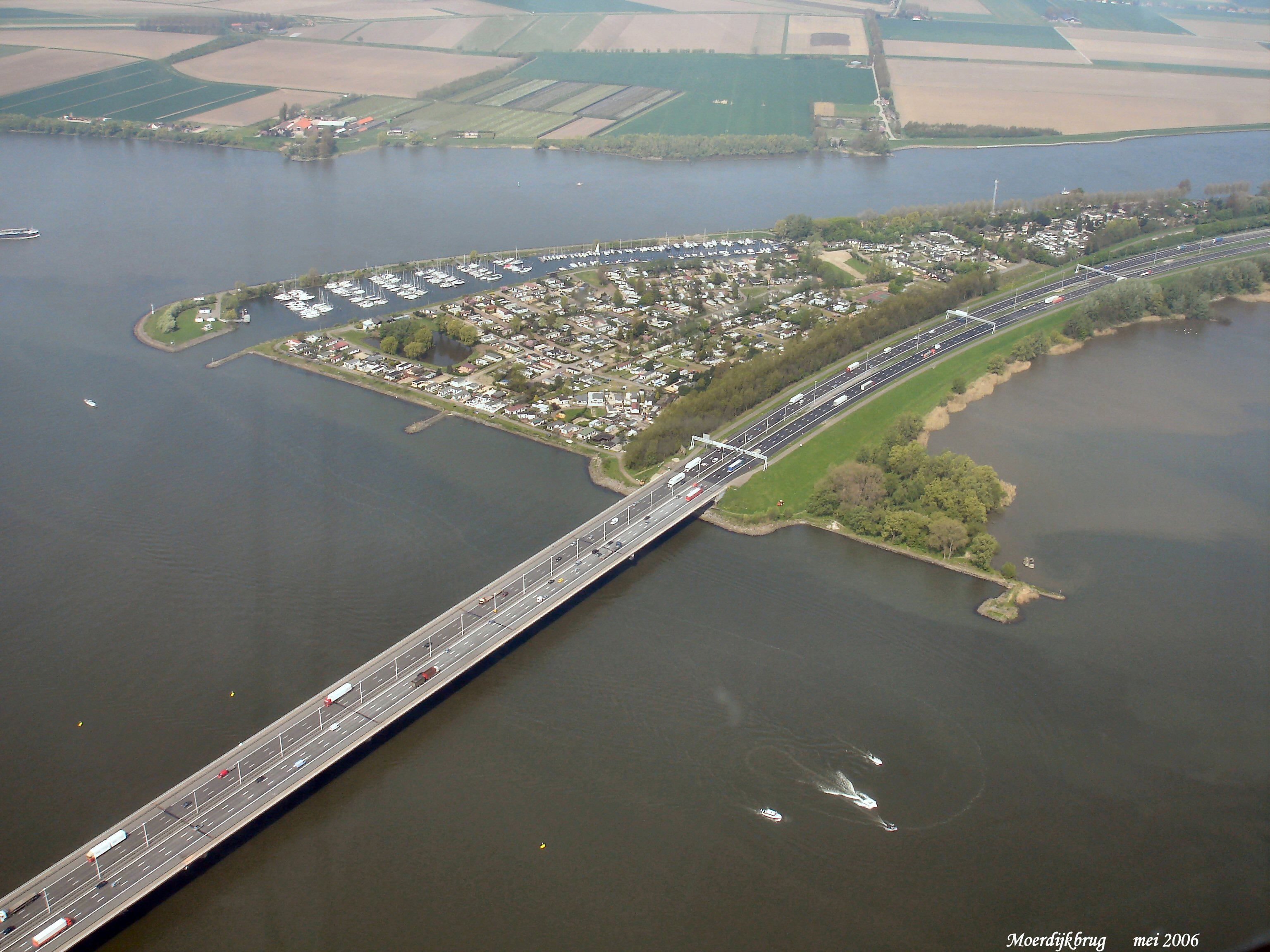 Moerdijk verkeersbrug over het Hollands Diep. rechts boven is de Kil met voormalige Camping Bruggehof, nu Euro Parcs "De Biesbosch" gezien in Noord/Westelijke richting.