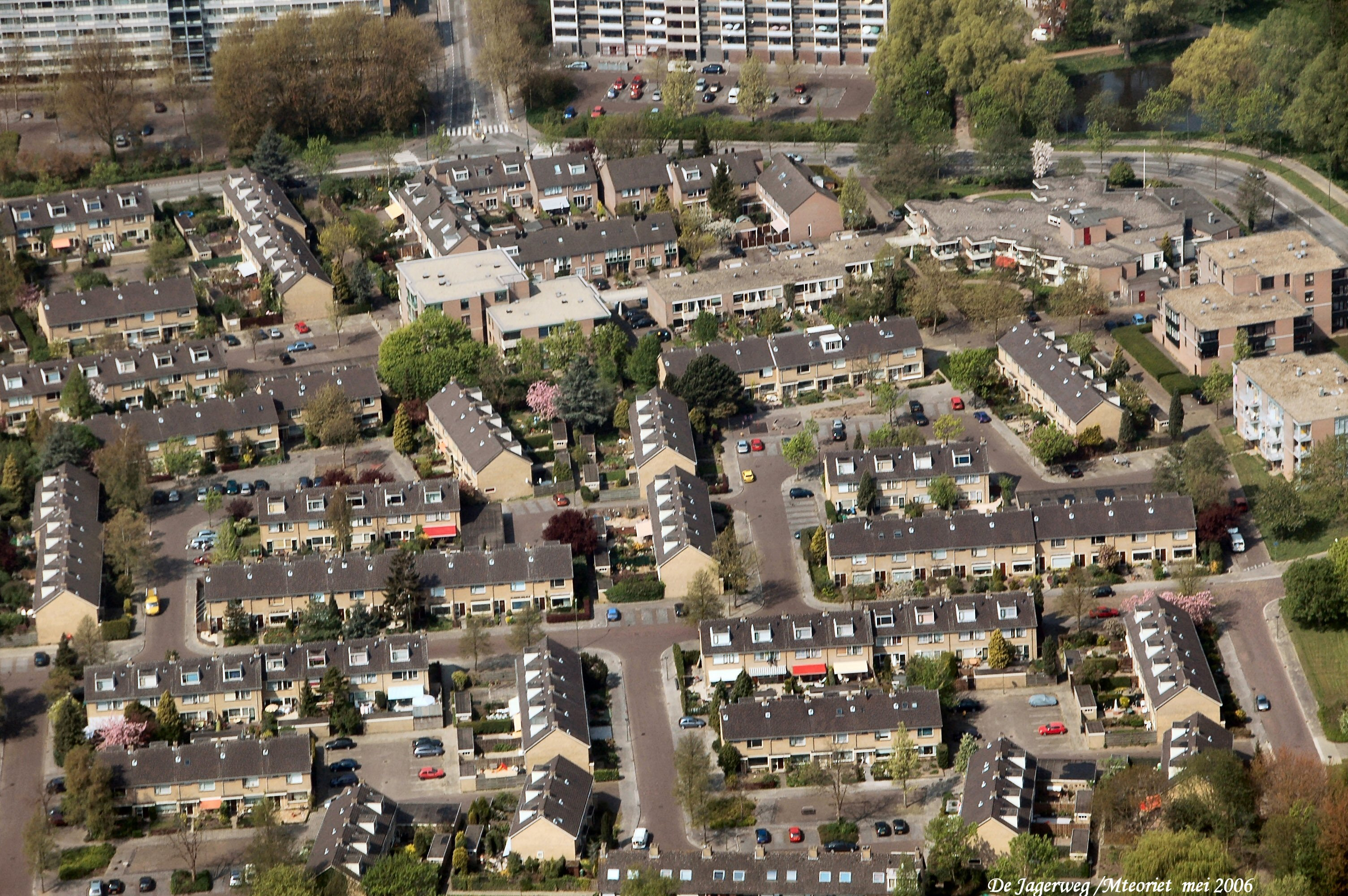 Boven is de Jagerweg met rechts de "Meteoriet" onder is de Minnaertweg gezien in Westelijke richting.