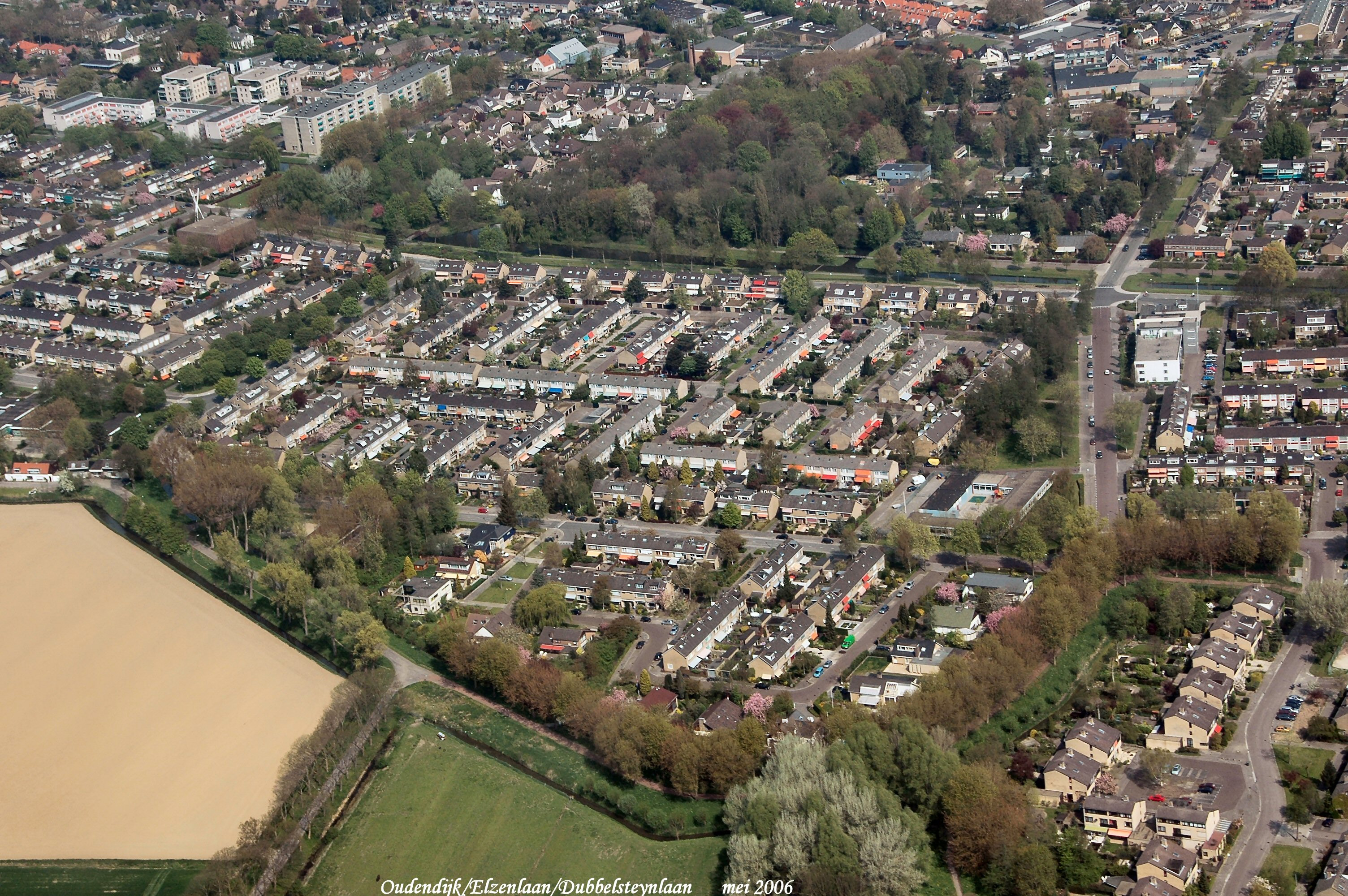 Onder is de Oudendijk. rechts onder is Middenhoeve. rechts boven naar onder is het Damplein met aansluitend de Elzenlaan. links boven is Gravenhorst met het Vijverplantsoen aan de Vijverlaan gezien in Noord/Westelijke richting.