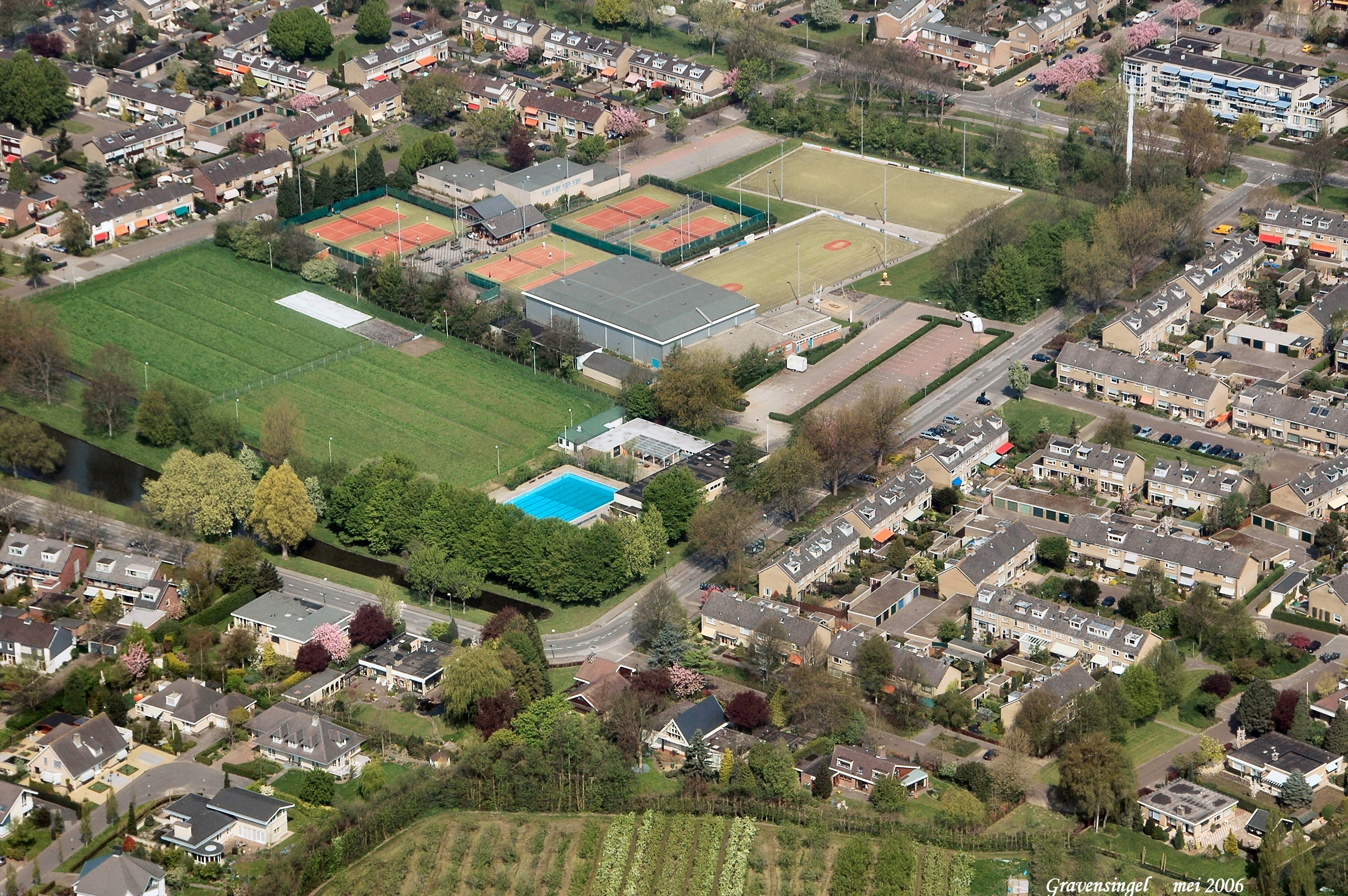 Onder is de Gravensingel met rechts boven de Dubbelsteynlaan Oost en de Repelaer. in het midden Sporting Delta en tennisver. Dubbeldam aan de Esdoornlaan. Mid.links is de IJsbaan "De Winterkoning met rechts er van zwembad "De Dubbel" gezien in Noord/Westelijke richting.