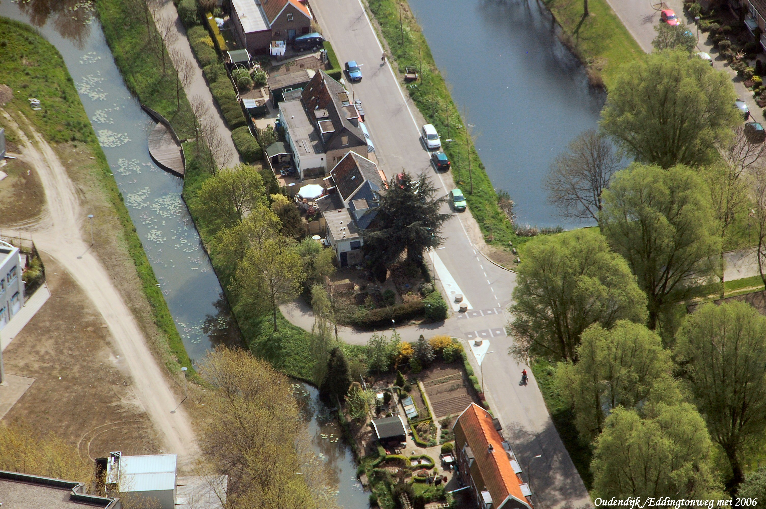 Oudendijk met rechts de Eddingtonweg gezien in Oostelijke richting.