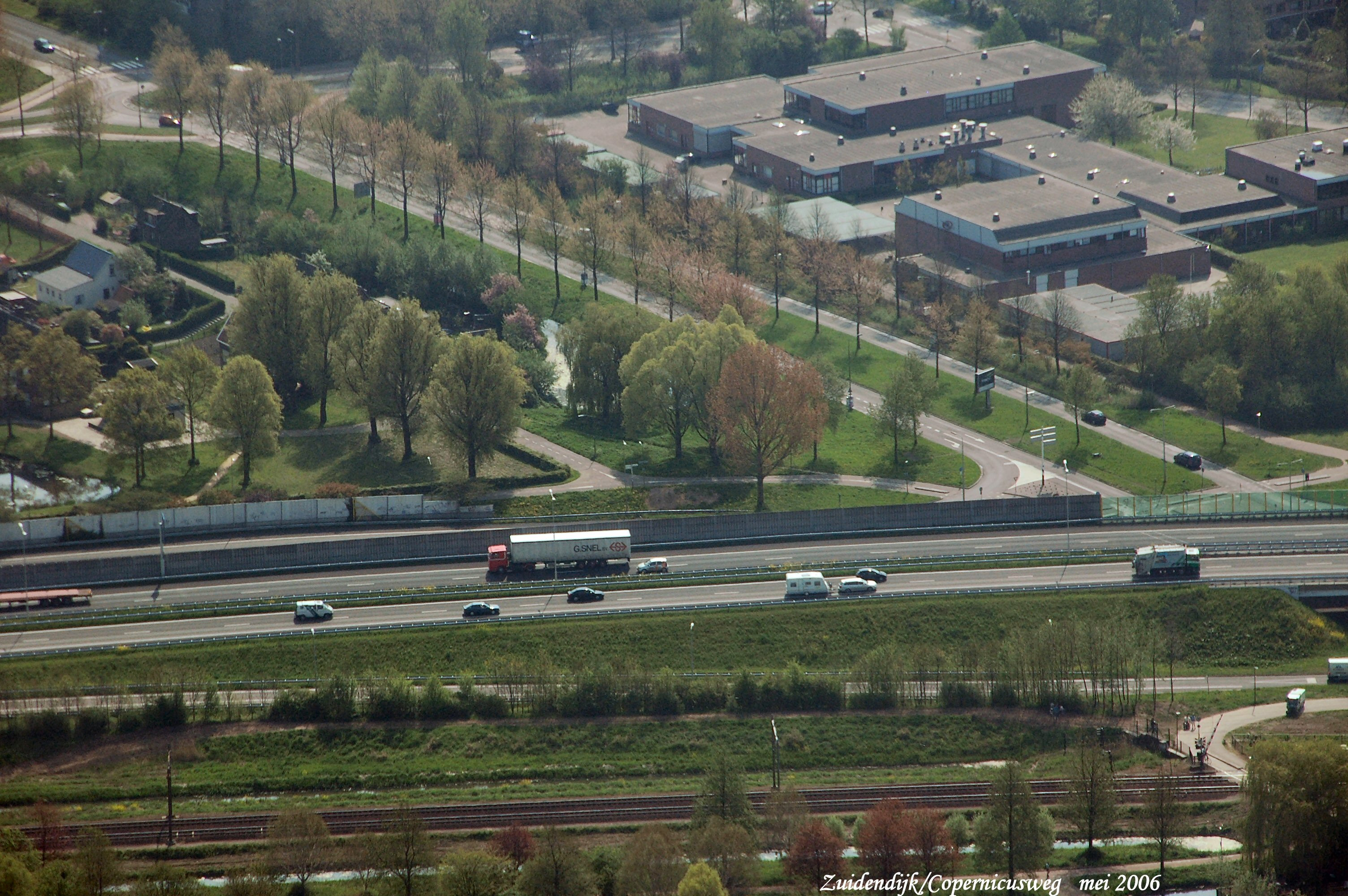 onder is het spoor van Dordrecht naar Breda met de Rondweg er boven. links boven naar rechts is de Copernicusweg met de Zuidendijk links er van gezien in Zuid/Oostelijke richting.