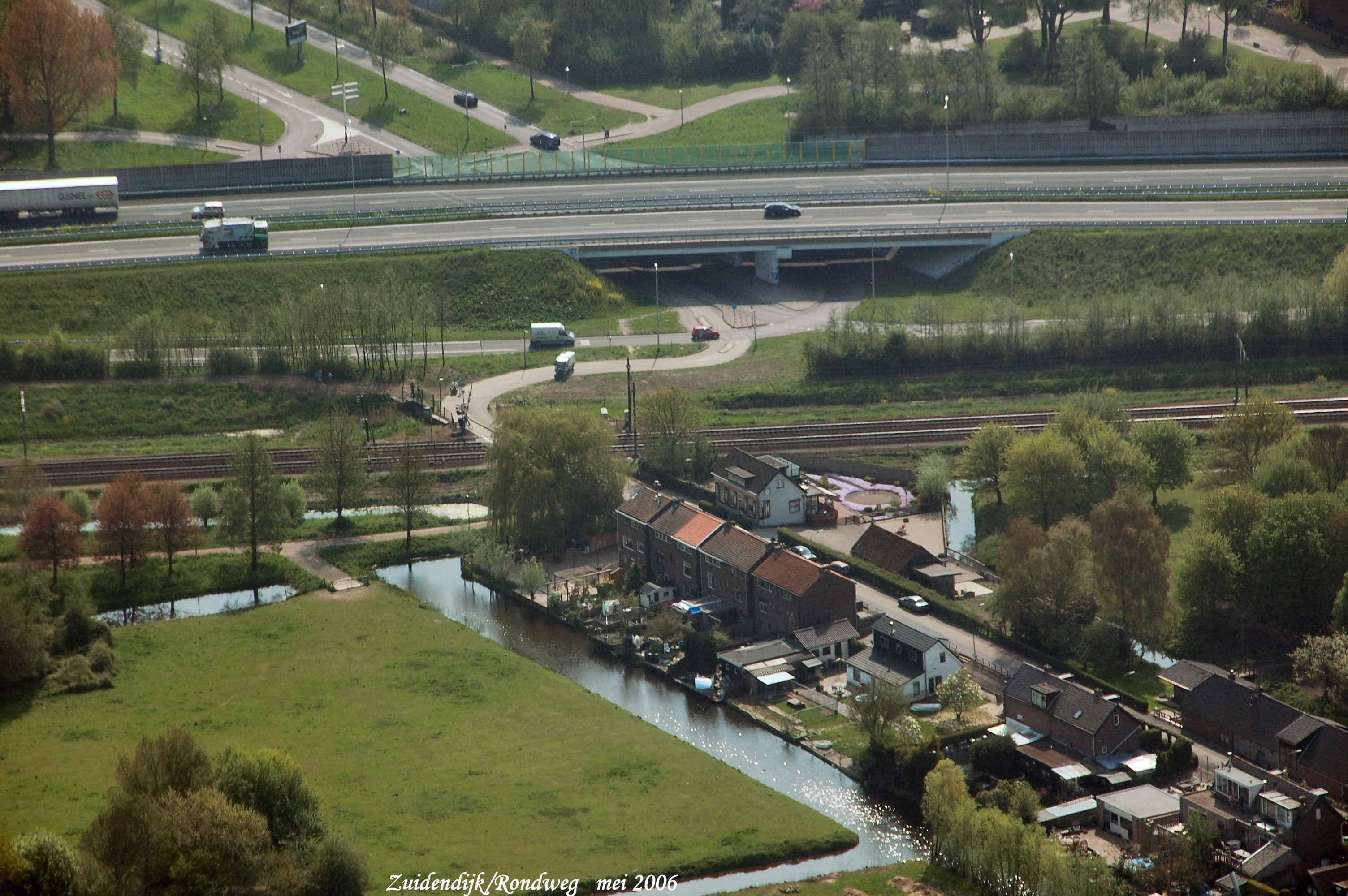 Rechts onder is de Zuidendijk met de spoorlijn Dordrecht-Breda en Rondweg boven. gezien in Zuid/Oostelijke richting.