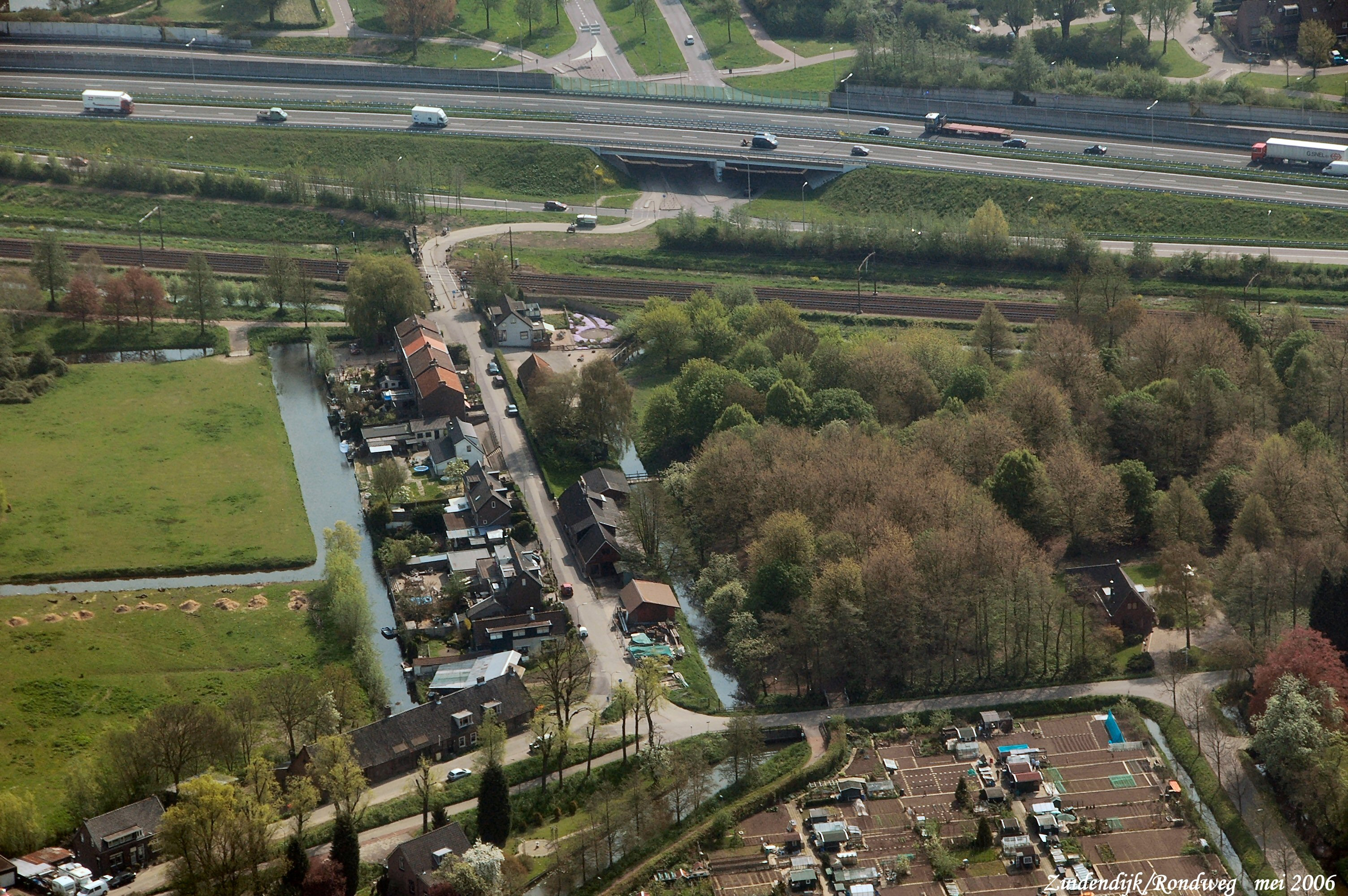Links onder is de Zuidendijk met boven de spoorlijn Dordrecht-Breda en Rondweg. rechts onder is de Reeweg Zuid met hier nog de volkstuinen van de "Vrije Tuinder" welke in 2020 zijn verkast naar sportpark Schenkeldijk. gezien in Oostelijke richting.