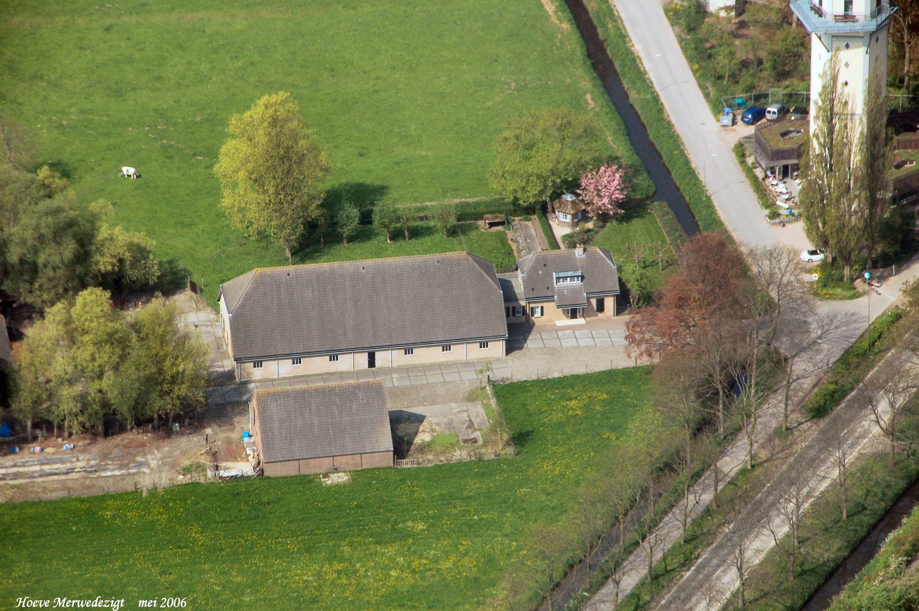 Rechts onder is de Provincialeweg met rechts boven de watertoren van Dubbeldam aan de Kromme Zandweg. In het midden is Hoeve Merwedezicht welke na de brand in 1990 weer geheel is herbouwd. gezien in Zuid/Westelijke richting.