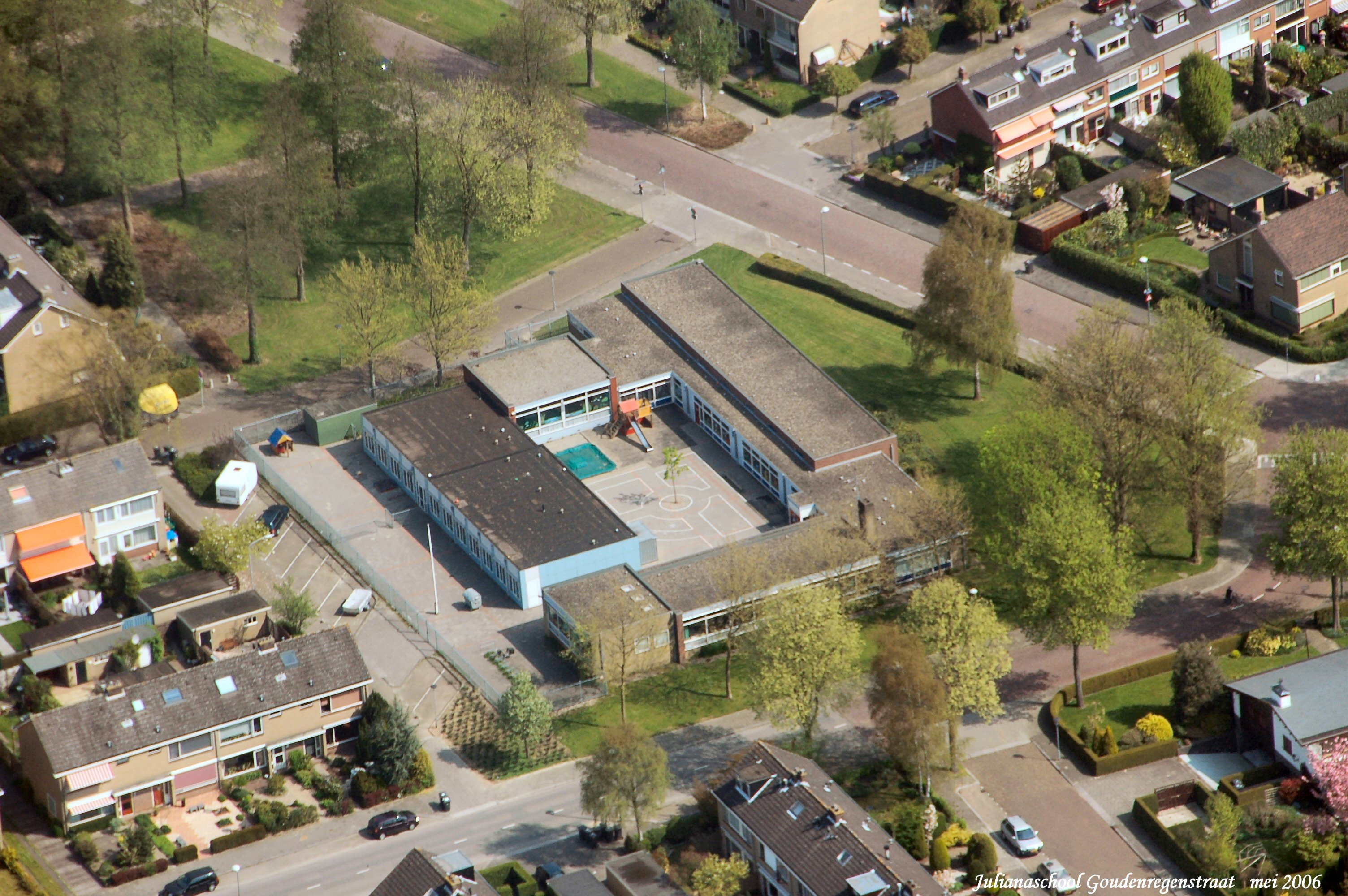 Julianaschool aan de Goudenregenstraat, boven is de Elzenlaan gezien in Noord/Oostelijke richting.