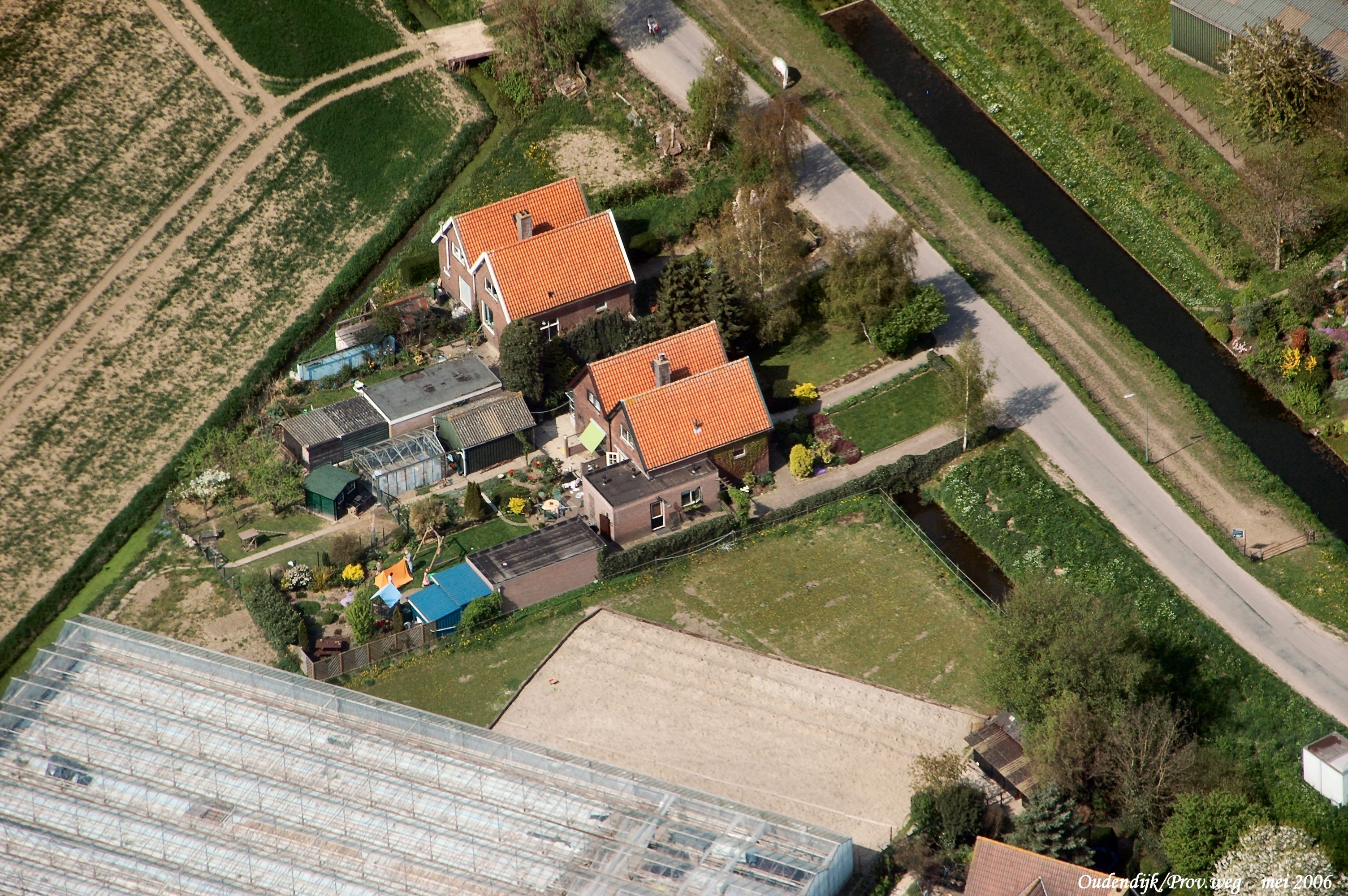 Oudendijk nabij de Provincialeweg met links de kassen van Schotman gezien in Zuid/Westelijke richting.